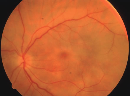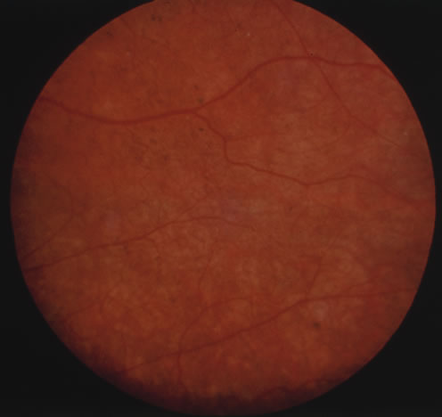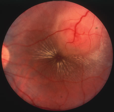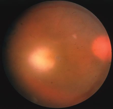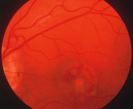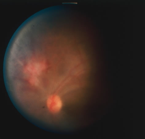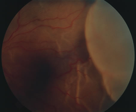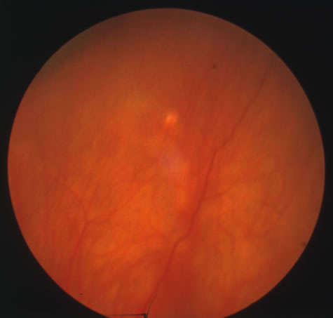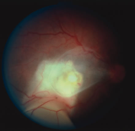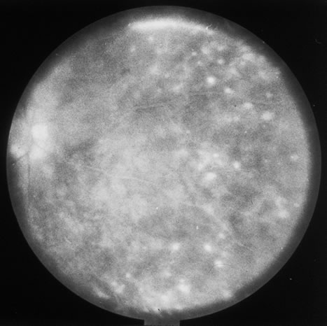 Almost all cases of toxoplasma chorioretinitis in adults are reactivations of congenital infection. Repeat attacks often develop in the same eye at the edge of old atrophic lesions and are believed to be caused by the breakdown of Toxoplasma cysts in the retina with renewed proliferation of the tachyzoite form. The acute lesions are elevated with indistinct borders and most often are located in the posterior pole. Ophthalmoscopy is frequently obscured by dense vitreous exudates, giving the classic “headlight-in-a-fog” appearance (Fig. 34). Retinal detachments or retinal breaks are more common in patients with myopia and severe intraocular inflammation and have a poor prognosis.141