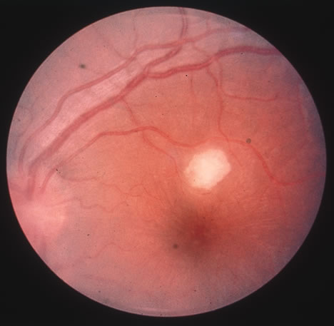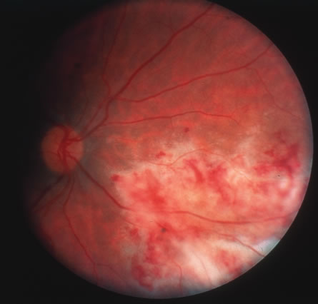 Scrapings of mucocutaneous lesions will demonstrate pseudohyphae on wet smear. Culture of vitrectomy specimens may yield organism in smear and culture. Diagnosis should be confirmed by culture on Sabouraud's medium or blood agar as well. Blood cultures are often negative with the exception of cases involving endocarditis. Cutaneous candidiasis is treated with topical clotrimazole, miconazole or nystatin powder. Intravenous amphotericin B is the drug of choice in disseminated candidiasis. Flucytosine is synergistic with amphotericin and given at a dose of 150 mg/kg per day allows for a decreased dosing rate of amphotericin. Ocular penetration of intravenous amphotericin is poor, therefore, pars plana vitrectomy and intravitreal injection of amphotericin should be considered, in addition to intravenous therapy. Vitrectomy may be useful for diagnosis as well as therapy. Amphotericin B has severe systemic toxicity as well as retinal toxicity often requiring discontinuation of therapy. It has been suggested that oral fluconazole may be used as initial treatment or in cases refractory to intraocular amphotericin.116 ASPERGILLOSIS Aspergillus is a common mold found throughout the world. It is most often associated with soil and/or decaying vegetation. Spores become aerosolized and enter human alveoli through inhalation of contaminated air. In a normal immunocompetent host the spores rarely cause disease. However, immunocompromised individuals such as those with leukemia, HIV, endocarditis or patients with heart, lung and liver transplants are at risk for devastating invasive disease caused by aspergillus. The most common species causing disease in humans is Aspergillus fumigatus, followed by A. flavus, A. niger, and A. nidulans.117 Diseases from infection with invasive Aspergillus include pneumonitis, sinusitis and rarely endophthalmitis. Endophthalmitis most commonly occurs through spread from adjacent sinus infection or via blood borne spread in intravenous drug users. Fungal endophthalmitis typically presents with rapid onset of pain, visual loss and a yellow macular infiltrate in the subretinal space which may progress to full-thickness retinal necrosis (Fig. 29). Aspergillosis is the second most common cause of endogenous endophthalmitis after Candidiasis.118,119 Other ocular manifestations of aspergillus infection include fungal keratitis, orbital abscess, orbital apex syndrome, and optic neuropathy.120 Aspergillus species have a tendency to invade blood vessels resulting in thrombosis, infarction, and necrosis of involved tissue.