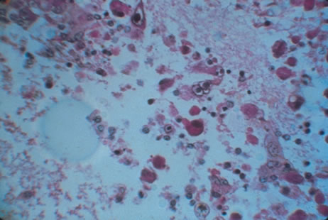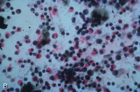In the immunocompromised patient, other pathogens must be excluded, even in the presence of positive CMV cultures or serology. Tissue culture methods may take as long as 4 weeks. IgM antibody develops in primary infection and then disappears over 6 to 9 months, but it may reappear with reactivation of infection. The IgM test has unfortunately low specificity and sensitivity in infants and is less helpful than urine culture obtained at birth or in the first weeks of life. Any cell type may be infected, appearing larger than normal (cytomegalic) and demonstrating eosinophilic intranuclear “owl's eye” and smaller intracytoplasmic viral inclusion bodies, which are better seen with Giemsa or Papanicolaou's stains (Fig. 8). Histologic examination of tissue specimens, including bronchoalveolar lavage fluid and urine, may be useful for diagnosis.