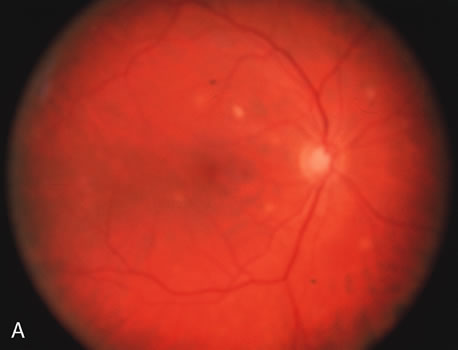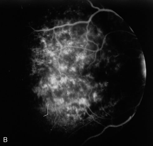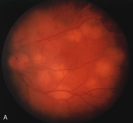 Mycobacterium avium-intracellulare (MAI), M. kansasii, and other atypical mycobacteria most commonly present as disseminated infections in patients with AIDS, with fever, sweats, chills, malaise, weight loss, and pulmonary and gastrointestinal symptoms. Signs of malabsorption, jaundice, skin lesions, and oral ulcers may be noted. Blood cultures, stool examination, and biopsy of various sites including lymph nodes, liver, gastrointestinal tract, skin and bone marrow may be useful for diagnosis by smear or culture. Antituberculosis therapy may improve symptoms, but such infections are generally regarded as incurable in those with AIDS. The fundus lesions of MAI consist of discrete yellow-white choroidal foci (Fig. 12A and 12B).32 Extrapulmonary M. tuberculosis is an indicator disease and is covered elsewhere in this chapter. Cryptosporidium species and Isospora belli are intestinal protozoa causing severe diarrhea in the immunosuppressed. Among patients with AIDS, it is more common in homosexual males and children. Stool specimens and intestinal and other biopsies may yield the organisms for diagnosis. Disease is usually self-limited but may be life-threatening in the compromised patient. Therapy is mainly supportive. Spiramycin, α-difluoromethylornithine, and furazolidone have been used to treat cryptosporidiosis, and TMP-SMX for isosporiasis, all with limited success. Giardiasis and amoebic colitis are also seen in patients with AIDS.33 Progressive multifocal leukoencephalopathy is a chronic central demyelinating disease caused by the papovavirus JC (Jacob-Creutzfeldt virus). The disease may begin with subtle encephalopathic signs, later demonstrating various focal deficits. Visual loss is frequently reported. Computed tomography typically shows multiple hypodense nonenhancing lesions in white matter, and cerebrospinal fluid is usually normal or shows elevated protein. Diagnosis is made by brain biopsy. There is no effective therapy.25 Lymphocytic interstitial pneumonitis (LIP) occurs in approximately half of children with AIDS. Pulmonary lymphoid hyperplasia (PLH) is a nodular variant of LIP. The LIP/PLH complex is yet another AIDS-related chronic pulmonary disease presenting with diffuse bilateral interstitial infiltrates. Biopsy demonstrates either nodular peribronchiolar lymphoid aggregates, or diffuse alveolar and peribronchiolar lymphocytic and plasma cell infiltrates. Exacerbations may indicate superimposed infection. Corticosteroid therapy is controversial.30,31 CMV, herpes simplex and zoster, candidiasis, cryptococcosis, toxoplasmosis, and other AIDS-related infections are described in detail elsewhere in this chapter. The ophthalmic findings associated with AIDS are reviewed in another chapter of this section. Approximately 80% of HIV-positive patients will have ocular manifestations during the course of their illness. Commonly encountered anterior segment manifestations include keratoconjunctivtis sicca, infectious keratitis, iritis, herpes-zoster ophthalmicus, Kaposi's sarcoma of the lid or conjunctiva, molluscum contagiosum and conjunctival microvasculopathy. Posterior segment manifestations include cytomegalovirus retinitis, VZV retinitis, toxoplasmic retinochoroiditis, infectious choroiditis, bacterial and fungal retinitis and the more recently reported chronic multifocal retinal infiltrates.32–39 Neuroophthalmic manifestations include papilledema, cranial nerve palsies, ocular motility disorders and visual field defects. They occur in 10% to 15% of patients with HIV infection. Serologic diagnosis of HIV infection uses enzyme-linked immunosorbent assay (ELISA) kits for serum antibody detection. These assays are highly sensitive and may demonstrate false-positive results. Positive tests are therefore confirmed by repeat ELISA, followed by the Western blot test, which relies on the banding pattern of serum antibody to electrophoretically separated viral antigens. Seroconversion usually occurs within 2 to 3 months, but may take much longer. Assay results will occasionally be read as indeterminate, indicating a reaction pattern that does not meet criteria for positivity, and retesting in several months is advised. Because of placental transfer of antibodies, a seropositive child younger than 15 months old must have other evidence of infection to support a diagnosis, such as clinical disease, positive HIV cultures, or HIV antigen testing. Serologic testing for HIV requires written informed patient consent in some locales, at least in part because of social stigmata associated with AIDS. Testing is now mandatory in the United States for blood donors, federal prisoners, military recruits and active-duty personnel, foreign-service officers, and immigrants to the United States. In addition to HIV serodiagnosis, absolute T4 lymphocytopenia is the most useful laboratory finding related to HIV infection. A count of less than or equal to 400 cells/mm3 increases the risk of progression to AIDS. Zidovudine (azidothymidine [AZT]) is a nucleoside analogue that inhibits viral reverse transcriptase. Zidovudine is virostatic, having no effect on latent virus. Taken orally, it has been shown to decrease symptoms, opportunistic infections, mortality rate, and HIV antigen values and to improve immunologic function in infected patients. The ability of HIV to undergo rapid antigenic variation of envelope glycoproteins, its low immunogenicity, and our incomplete understanding of what constitutes a protective immune response have contributed to the difficulty in developing an effective vaccine. Several other antiretroviral agents known by their classification as nucleoside analogues, nonnucleoside analogues, or protease inhibitors have been introduced. Nucleoside analogues inhibit transcription of the HIV virus by blocking the enzyme reverse transcriptase, thereby inhibiting replication of the virus. Nucleoside analogues include Didanosine (ddI), Zalcitabine (ddC), Stavudine, (d4T) and Lamivudine