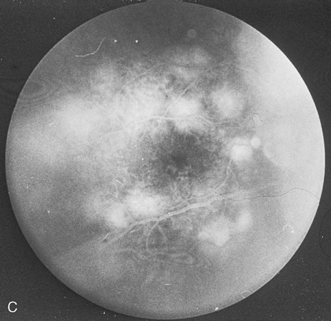 HIV infection results in depletion of T4 cells, which are central to various forms of immune responsiveness. Risk of developing AIDS is inversely related to the absolute T4 cell count. Antigen-responsive T cells become selectively depleted or functionally impaired early in the course of AIDS. There is diminished helper function for B-cell responses, depressed cytotoxic and natural killer cell responsiveness, decreased blast transformation, and decreased lymphokine production. Infected patients' B-lymphocytes spontaneously produce immunoglobulin, resulting in hypergammaglobulinemia, but are unable to produce specific antibody in response to new infections. Anergy is common. HIV also infects other cells that express the CD4 antigen, such as monocytes and macrophages, but is not cytopathic in these cells. HIV has been identified in brain capillary endothelium, oligodendrocytes, astrocytes, lymph node dendritic cells, Langerhans' cells, intestinal mucosa, myocardium, tears, corneal epithelium, aqueous, vitreous, and retina. Clinical manifestations of HIV are protean. Seropositive persons may be asymptomatic. Various acute HIV infection syndromes have been described. An acute mononucleosis-like syndrome, with fever, malaise, rash, lymphadenopathy, pharyngitis, myalgias, and arthralgias, has been noted after recent HIV exposure. Acute neurologic manifestations resembling aseptic meningitis, encephalitis, or focal lesions may be seen.25 AIDS-related complex is a somewhat ambiguous term encompassing features such as chronic fever, night sweats, weight loss, fatigue, generalized lymphadenopathy, chronic diarrhea, and laboratory abnormalities. AIDS-related complex implies an intermediate stage in the spectrum of HIV disease. CDC-defined indicator diseases include HIV encephalopathy, HIV wasting syndrome, CMV disease not involving liver, spleen or lymph nodes (26), progressive multifocal leukoencephalopathy, recurrent Salmonella septicemia, multiple or recurrent serious bacterial infections in children, extrapulmonary myobacterial infection, disseminated histoplasmosis, disseminated coccidioidomycosis, chronic isosporiasis, lymphoid interstitial pneumonia or pulmonary lymphoid hyperplasia in children, primary brain lymphoma, and various non-T–cell non-Hodgkin's lymphomas. Less specifically associated with HIV infection are manifestations of papillomavirus, molluscum contagiosum, VZV, Epstein-Barr virus, hepatitis B virus, chlamydia, gonorrhea, syphilis, campylobacter, pityrosporum, trichophyton, aspergillus, acanthamoeba, entamoeba, giardia, strongyloides, basal cell carcinoma, squamous cell carcinoma, idiopathic thrombocytopenic purpura, cerebrovascular infarction, and intracranial hemorrhage.27–30 Pneumocystis carinii pneumonia once was the most common presentation of AIDS. It is typically of insidious onset, with features including dry cough, dyspnea, and a diffuse bilateral interstitial infiltrate evident on a chest roentgenogram. Typical multifocal fundus lesions have been described. They are yellow-white and have a characteristic pattern on fluorescein angiography (Fig. 10A, 10B, and 10C). Diagnosis is made by demonstrating the protozoon via sputum induction, bronchioalveolar lavage, and transbronchial or open-lung biopsies. Treatment modalities include trimethoprim-sulfamethoxazole (TMP-SMX).31 Kaposi's sarcoma is much more frequent in male homosexuals and bisexuals than in other patients with AIDS. Cutaneous lesions are usually red or violaceous, palpable, and nonblanching papules, nodules, or plaques, often appearing on the hard palate, nose, eyelid, and conjunctiva (Fig. 11). Visceral and lymph node involvement is common and often clinically silent. Biopsy specimens show proliferation of small, incompletely formed blood vessels lined by unusually large endothelial type cells, with extravasated red blood cells and infiltrates of spindle-shaped cells. Chemotherapy with etoposide, Vinca alkaloids, or interferon-α may be indicated in advanced cases.28