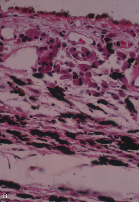 Histopathology of sympathetic ophthalmia shows granulomatous uveal inflammation with epithelioid cells, lymphocytes, multinucleated giant cells, eosinophils, and a few plasma cells. Generally there is sparing of the choriocapillaris. Epitheliod cells contain phagocytosed uveal pigment (Fig. 60). The granulomatous inflammation may extend into the scleral canal. Macular edema, with fluid accumulating in the outer plexiform layer as well as serous detachment of the sensory retina in the posterior pole can be observed (Fig. 61). Historically, 25% of cases of sympathetic ophthalmia have been associated with phacoanaphylactic endophthalmitis. In the injured eye one can see uveal prolapse, with a track of the wound to the limbus. There is extensive inflammation and Figure 62 is an artist's drawing from Fuchs' Atlas of Pathology showing panuveal inflammation; the pink areas represent epitheliod cells, whereas the dark zones are lymphocytic infiltration that has given rise to a marbleized appearance. Eosinophils may be readily seen among the lympocytes.