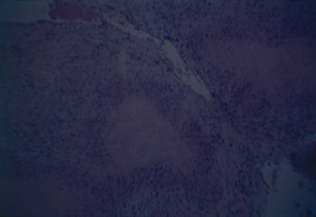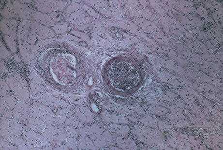 Histologically, the tracks of migrating larvae are marked by hemorrhagic necrosis and infiltration by eosinophils and lymphocytes. Remains of larvae are found within the granulomas, which contain closely packed eosinophils and histiocytes (Fig. 37).