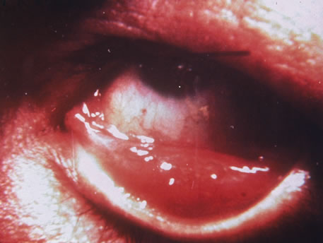 Therapy for genital chlamydia infection is administration of tetracycline, doxycycline, or erythromycin for 2 to 3 weeks. Asymptomatic sexual contacts should be treated as they are likely to harbor genital chlamydial infections. Treatment failures are rare. The recommendation has been made to test conjunctival scrapings three weeks following completion of the course of antibiotics as some patients may require two to three courses of antibiotic therapy.59 TUBERCULOSIS Mycobacterium tuberculosis is a bacterium that causes infection through inhalation of aerosolized droplets filled with the organism. An asymptomatic pulmonary granuloma may develop and reactivate at any point, particularly when accompanied by diseases such as HIV, malignancy, and diabetes mellitus. Rates of reactivity have been found to be highest in non-white, older men of lower socioeconomic status. In the last decade a resurgence of tuberculosis (TB), particularly in crowded urban settings such as New York City, has been noted.60 Ocular involvement most commonly occurs after reactivation in the lung or alimentary tract and is thus referred to as secondary TB (Fig. 16). Primary ocular involvement of TB is rare and is almost always limited to the cornea and conjunctiva. Conjunctival TB has been reported as a chronic unilateral conjunctivitis with a conjunctival mass or ulceration associated with regional lymphadenopathy. Although also rarely seen, conjunctival phlyctenulosis has been found to be associated with tuberculoprotein hypersensitivity. Biopsy and culture proven scleral TB was reported in the literature in 1976 and 1989. Other ocular manifestations of TB include anterior uveitis, either granulomatous or nongranulomatous, choroiditis, and choriodal tubercles/tuberculoma. A recent case series demonstrated the protean ocular findings associated with intraocular TB in addition to a variable response to antitubercular treatment.61