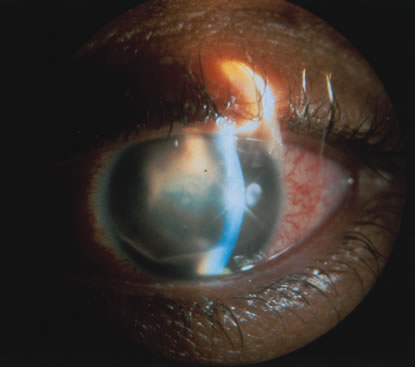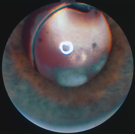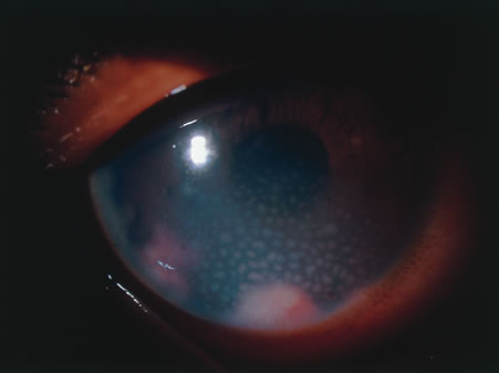 The most common organisms responsible for acute onset endogenous endophthalmitis in the United States are gram-positive bacteria. Streptococcus species are the most common group, but Staphylococcus aureus is the single most common organism.94 Bacillus cereus is associated with intravenous drug abuse. Meningococcal and Hemophilus infections occur with meningitis in otherwise healthy young patients. S. aureus and streptococci are associated with skin lesions and chronic debilitating disease such as malignancies, diabetes, and renal failure. The gram-negative bacilli are agents of urinary tract and gastrointestinal infections, often in diabetics. Nocardia causes pulmonary infections in the immunosuppressed. Actinobacillus may be responsible for endocarditis. Klebsiella pnemoniae has recently emerged as a more commonly identified cause of gram-negative endophthalmitis than previously reported.96 Definitive diagnosis is made by recovery of the organism from the eye. Anterior chamber paracentesis is more helpful in cases of endogenous endophthalmitis than in postoperative endophthalmitis. Vitreous biopsy may not be necessary in all cases, such as in patients with known sites of extraocular infection. Blood and urine cultures are always indicated, and other specimens may be helpful, depending on the clinical picture. Antigen studies such as counter immunoelectrophoresis or latex agglutination tests may aid rapid diagnosis. Intravenous antibiotic therapy is mandatory in doses comparable to those for meningitis or similarly serious infection. Drugs of choice should be appropriate to the likely organisms at the primary infectious focus. In cases of intravenous drug abuse, clindamycin plus an aminoglycoside must be considered for treatment of B. cereus. Intravenous antibiotics combined with vitrectomy and intravitreal antibiotics achieved the best outcome in terms of visual acuity in a recent retrospective study.97 It is postulated that because the eye is involved via hematogenous spread, infection is established in perivascular foci, local vascular permeability is increased, and thus the intravenous route of therapy is most effective. Later use of corticosteroids may be considered. Vision of finger counting or better is retained in 40% of eyes. A better result is achieved in patients who are diagnosed early and receive appropriate treatment. Patients with N. meningitis or H. infuenzae endophthalmitis do relatively well. B. cereus and enteric gram-negative rod infections tend toward very poor outcomes. Death is a common result in septic, chronically debilitated patients. PROPIONIBACTERIUM ACNES Propionibacterium acnes is an anerobic bacterium that is most commonly associated with late onset postoperative endophthalmitis.97 Classic presenting signs include chronic low-grade uveitis which may or may not be granulomatous, accompanied by a white fibrous plaque on the posterior lenticular surface. This plaque is thought to harbor the bacteria (Fig. 25). Disruption of the plaque through the use of a yttrium aluminum garnet (YAG) laser may disperse the organisms, further increasing the degree of intraocular inflammation. Patients may also present with a hypopyon.