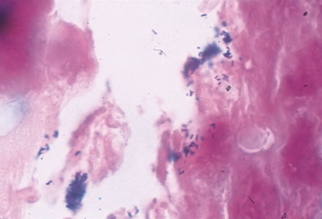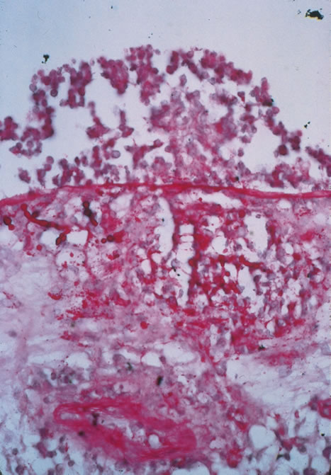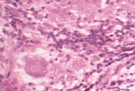 Histologically, lymph nodes contain nonspecific reactive hyperplasia with granuloma formation and occasional central necrosis. B. henselae organisms may be demonstrated in involved lymph nodes using the Warthin-Starry silver stain or electron microscopy (Fig. 23). The diagnosis can be made clinically in the majority of patients who have regional adenopathy, an identifiable inoculation site, and exposure to cats. Diagnosis is best supported by the presence of high anti-B. henslae serum antibody titers. Pyogenic infections, atypical mycobacterial infection, tularemia, early Hodgkin' s disease, and early tuberculosis can produce a similar clinical picture. Biopsy of enlarged lymph nodes should be reserved for cases in which the diagnosis is in doubt and delay might hinder the treatment of malignancy.