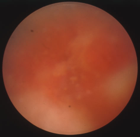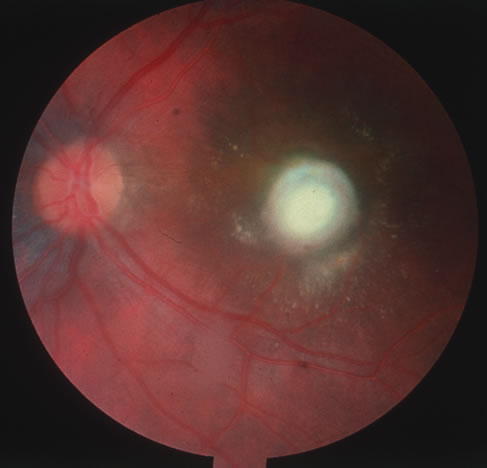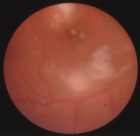 CANDIDIASIS Candidiasis is a fungal infection that is often encountered as a commensal of the mouth, stool, vagina, and conjunctiva that may become a disseminated deadly infection, particularly in the immunosuppressed. The clinical importance of early suspicion and rapid identification of these organisms has become of increasing importance as the incidence of reported candidemia continues to increase. Candida albicans is the most commonly reported of the species, but other species of pathogenic importance continue to be identified. Donahue and colleagues114 identified the following species in a prospective review of intraocular candidiasis in patients with candidemia: C. albicans, C. tropicalis, Torulopsis glabrata also known as C. glabrata, and C. parapsilosis, which is particularly noted for its ability to cause endocarditis. Oropharyngeal thrush is a common neonatal condition presenting as discrete white plaques on the oropharyngeal mucosa. Oral thrush is also common in HIV infection and often involves the distal portion of the esophagus. Cutaneous candidiasis manifests in the intertriginous areas presenting as a red macerated rash. Vulvovaginitis can develop in females and similarly urethritis or balanitis may develop in the male genital tract. Disseminated candidiasis is most common in patients with AIDS, intravenous drug users and hospitalized patients being treated with intravenous broad spectrum antibiotics, particularly diabetics, neonates, and burn patients. Dissemination may cause pulmonic infiltrates, endocarditis, meningitis, brain abscess, arthritis, osteomyelitis, choroiditis, or retinitis (Fig. 27). Extension of the infection into the vitreous causing endophthalmitis also occurs in candidemia. The ocular sequelae can have devastating consequences resulting in total loss of vision (Fig. 28). Funduscopic examination is therefore advised in all patients with candidemia, particularly in patients who have visual complaints, are immunosuppressed or have multiple positive blood cultures. Other ocular findings include corneal ulceration often in the presence of preexisting corneal disease. Two recent case reports of such fungal keratitis demonstrate coinfection with Steptococcus species suggesting a synergistic relationship.115
