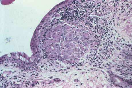Classic histopathology consists of caseating granulomatous inflammation in a zonal distribution. The noncaseating tubercle may be present but is less specific (Fig. 18). The organism is acid-fast, meaning that it does not decolorize with acid alcohol after staining with basic fuchsin, appearing as bright red, long thin rods. A definitive laboratory diagnosis of intraocular tuberculosis may be made via anterior chamber tap, vitreous or chorioretinal biopsy depending on the site of inflammation. The PCR may be helpful in making the diagnosis.