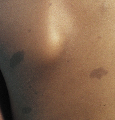 The PWS may not entirely respect the midline, possibly a reflection of transmedian innervation.212 The lesion grows proportionally with the child, often becoming darker in color. 213 The overlying skin may develop nodularity or hypertrophy in two-thirds of patients (by the fifth decade).214 Treatment with a pulsed-dye laser may significantly improve the appearance, but recurrence (i.e., redarkening) is possible.215,216 A deficit in the number of perivascular nerves in port-wine stains suggests that abnormal neural modulation of vascular flow may be involved in their pathogenesis.217 Intracranial leptomeningeal capillary vascular malformation (Figs. 21 and 22) is associated with seizures and contralateral neuromuscular weakness. Central nervous system involvement correlates highly with ipsilateral involvement of the V1 dermatome by a PWS.208,218