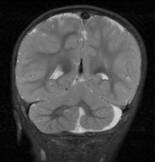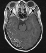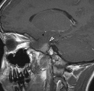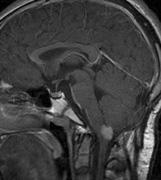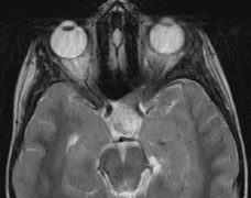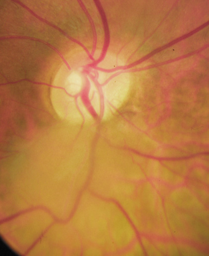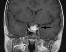 The incidence of optic pathway gliomas in NF1 is difficult to estimate, as the majority are asymptomatic and do not affect vision. In NF1, radiographic evidence of an optic nerve glioma occurs in 15% of patients.64,65 Most tumors are neither suspected historically nor detected by ophthalmic examination.65 Even when optic nerve gliomas become clinically detectable, visual function often remains stable in the absence of any intervention.66,67 Thus routine computed tomography (CT) imaging, even in patients with a known optic nerve glioma, is controversial. The potential risks of repeated radiation exposure in a child with a tumor-suppressor gene defect is a consideration. MRI studies are more revealing than CT but may require sedation or anesthetic and are costly. An MRI is often recommended at the time of diagnosis, but in most cases routine “follow-up” MRIs are unnecessary. Annual ophthalmic clinical examination for relative afferent pupillary defect (RAPD), visual acuity, visual fields, color vision, and funduscopy is usually all that is required, as no therapeutic action is likely to be taken unless there is significant and progressive visual involvement. Optic nerve gliomas may involve the optic chiasm and be associated with endocrine disorders or nystagmus.68–70 Surgical excision of chiasmal gliomas (Fig. 6) carries a high risk of visual loss. Invasion of the hypothalamus or the third ventricle carries a poor prognosis, with greater than 50% 15-year mortality rate.71 One review of radiation treatment for chiasmal gliomas collated data from small case series and found no significant long-term improvement in visual function, progression, or mortality with radiation treatment.71 Other reports suggest that radiation doses over 4500cGy improve symptoms and slow progression of chiasmal gliomas over several years.72 Adequate tumor coverage by radiotherapy results in irradiation of normal brain and nearly all children need hormone replacement.73 Chemotherapy is an alternative.74,75
