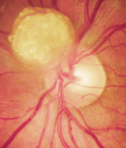 SEIZURES. Typically observed first in infancy, seizures are a common presenting sign of TSC and a frequent source of morbidity. The seizures often begin as “salaam spasms”—repetitive myoclonic spasms that produce head nodding with associated extension/flexion of the trunk and limbs. They often progress to grand mal seizures25,116 and may be difficult to control. Vigabatrin has been advocated for control of infantile spasms but it carries a risk for irreversible visual field loss. Other treatments include corticosteroids, adrenocorticotrophic hormone, and a ketogenic diet.25,137–139 Selective surgical excision of an “epileptogenic tuber” may be an option for intractable epilepsy.140 MENTAL RETARDATION. Mental deficiency, part of Vogt's diagnostic triad (adenoma sebaceum, epilepsy, mental deficiency),3 affects about 50% of patients overall.25,141 TSC2 mutations may carry a higher risk than TSC1.142 AUTISM. This may affect 50% to 60% of TSC patients, possibly correlating with numbers of cerebellar and temporal tubers.25,143,144 Visceral Findings Patients with TSC may have renal, cardiac, pulmonary and other visceral involvement. RENAL. The TSC2 gene was localized by linkage with the polycystic kidney disease gene in patients with TSC and polycystic kidneys. This represents a contiguous gene syndrome in which adjacent genes (PKD1 and TSC2) are deleted together.145–147 Multiple angiomyolipomas of the kidney are benign hamartomas of blood vessels, smooth muscle, and fat. By 10 years of age, the frequency of angiolmyolipomas is 75%, similar to adults.148 The fat signal of angiomyolipomas helps to distinguish them from renal cell carcinoma.25 Renal insufficiency/failure may be the complication of both cystic disease and angiomyolipomas and is one of the leading causes of morbidity and mortality in TSC.138,149 CARDIAC. Rhabdomyoma are usually multiple, typically asymptomatic, and often regress with age.150,151 PULMONARY. Lymphangioleiomyomatosis is a progressive lung disease characterized by bronchiolar smooth muscle infiltration and cystic changes of the lung parenchyma. About 1% of adult females with TSC are affected.116,152,153 OPHTHALMIC FEATURES The principal ophthalmic manifestations of TSC are in the posterior segment. Astrocytic Retinal Hamartomas Although in Van der Hoeve's original description the term phakoma or phakomata was a generic term for the tumors occurring in various organ systems,1 it has become associated with the retinal astrocytic tumors of TSC,3 which occur in about 50% of affected patients and are bilateral in 25% to 30% (Table 3, Fig. 16).154,156