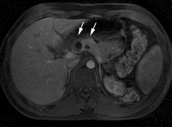 PANCREAS. Pancreatic lesions may be nonsecretory (most commonly cysts or cystadenomas) or secretory (islet cell tumor).179 In one study of 52 patients, 56% (29 patients) were found to have pancreatic lesions. The majority (19 of 29) had cystic changes only (Fig. 17C). Pancreatic lesions were the only abdominal manifestation of disease in 6 of 52 patients.180 In a separate study, pancreatic cysts did not show significant progression on follow-up examinations over an average period of 5 years.181 Like pancreatic cysts, islet cell tumors appear to be frequently asymptomatic.182 EPIDIDYMIS AND BROAD LIGAMENT. Papillary cystadenomas of the epididymis are typically benign and asymptomatic. In one study, about half of patients were affected.183 Papillary cystadenomas of the broad ligament are thought to be the female equivalent of papillary cystadenomas of the epididymis.184 OPHTHALMIC FEATURES VHL syndrome does not appear to have significant anterior segment manifestations. Posterior Segment Retinal capillary hemangiomas are among the most frequent and earliest manifestations of VHL syndrome. Most patients present between 10 and 40 (mean age of 25) years of age and 5% present before age 10. Overall, retinal capillary hemangiomas affect about 60% of individuals with VHL syndrome. Development of new retinal capillary hemangiomas after age 60 years is unusual.169,170 Retinal capillary hemangiomas (Fig. 18) may be the only manifestation of the syndrome,185 and typically involve the midperipheral temporal retina.186 A pair of dilated and tortuous retinal vessels (artery and vein) classically supply the vascular tumor. Without fluorescein angiography, it may be difficult to distinguish artery from vein on fundus examination.170