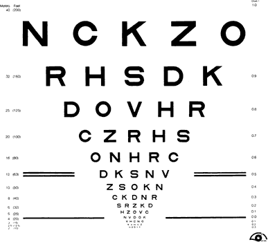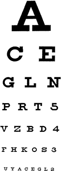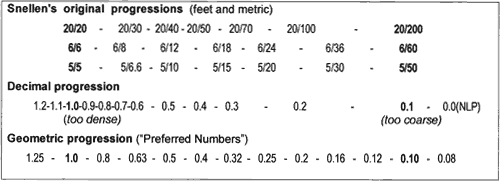 Although these changes were made a quarter century ago, the use of the term blindness to denote partial vision loss is still prevalent. This is regrettable, since it fosters misconceptions among patients and practitioners. Patients tend to accept the statement that they are legally blind as an irreversible verdict of hopelessness. Telling them that they have severe low vision (the corresponding ICD-9-CM term) tells them that they have a problem but that there are ways to cope with it. To call a patient with a severe vision loss “legally blind” is as preposterous as calling a patient with a severe heart ailment “legally dead.” Measurement Considerations Letter recognition, on which clinical visual acuity measurement is based, is a rather complex function that involves not only optical factors but also cognitive and motor abilities. When choosing our test parameters, we strive to keep the cognitive and motor requirements minimal so that we measure mainly optical factors. Within the group of optical factors, we strive to keep factors such as contrast and illumination optimized so that the main remaining variable is magnification. Visual acuity can be thought of as the reciprocal of the magnification threshold for letter recognition. Magnification is the factor on which Snellen's formula is based. If a subject needs letters that are twice as large or twice as close as those needed by a standard eye, the visual acuity is said to be 1/2 (20/40, 0.5), if the magnification need is 5× , the visual acuity is 1/5 (20/100, 0.2), and so forth. It is not always possible to avoid the cognitive factors. This is the case for infants and preschool children who do not yet know the entire alphabet. For them, we often use other methods, such as grating detection or picture recognition. It is important to realize that these are different tasks, which may have different magnification requirements. Similar considerations exist for developmentally delayed individuals. Sometimes it appears that the motor concept of directionality that is required to respond to tumbling Es is a limiting factor. Testing with different modalities may help to give an insight into these nonoptical factors. In elderly stroke patients with macular degeneration, the question may arise whether inability to read is the result of the macular degeneration or of the stroke. Failure to respond to larger print may point to cognitive rather than optical factors. In the following discussions, it will be assumed that cognitive and motor factors are indeed trivial. Even so, many choices remain to be made, including test distance, letter size progression, criterion, contrast and illumination, visual acuity notation, and test symbols. CHOICE OF TEST DISTANCE FOR NORMAL AND NEAR-NORMAL VISION. Most patients seen in ordinary practice have visual acuity in the range of normal and near-normal vision (20/60 or better, ICD-9-CM; see Table 3). For these patients, the most commonly used testing distances are 20 feet, 6 meters, and 5 meters. These distances were chosen not because they are especially appropriate for visual acuity measurement but because at these distances the optical difference with infinity may be ignored. The stimulus for the development of the letter chart came from Donders' work on refraction. Traditional chart designs reflect the emphasis on screening and on refractive use. In the near-normal range, the steps between letter sizes are small; for lower acuity they become larger (see Fig. 10); for acuity worse than 20/200 (0.1), vague statements such as “count fingers” and “hand motions” are used.