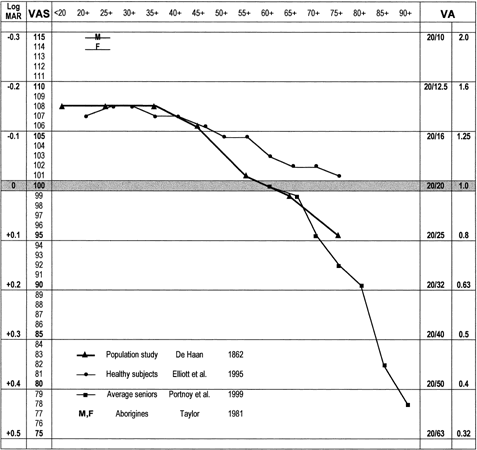 Louise Sloan also proposed a new letter size notation.26 To implement Donders' definition of visual acuity as the ratio between a subject's performance and a standard performance, Snellen had used the following formula: