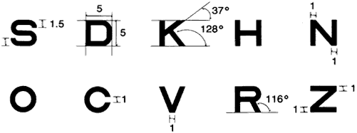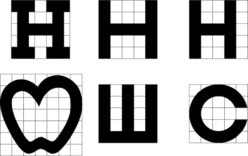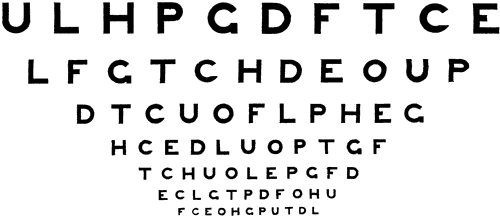 1909. Relatively little happened in the period that followed. Efforts at standardization were made, such as a standard proclaimed by the International Council of Ophthalmology in 1909.24 Such documents were filed and never gained a wide following. That clinicians did not feel an urgent need for standardization can be explained by the fact that the everyday letter chart uses do not require it. For refractive correction, any set of targets will do, since the only question is “better or worse?” For screening, the distinction between “within normal limits” and “not within normal limits” is the most important. We have seen that Snellen's standard is well positioned for screening purposes. At the lower end, the difference between 20/200 (0.1) and 20/400 (0.05) is unimportant for screening purposes. After 1945 the interest in low-vision rehabilitation was gaining ground. It was recognized that most of those considered “industrially blind” actually had some level of usable vision. In 1952 the first low-vision services were opened in New York at the Industrial Home for the Blind and at the New York Lighthouse. For rehabilitation purposes the difference between 20/200 and 20/400, which was unimportant for screening, became very important, since the patient with 20/400 needs twice as much magnification as the patient with 20/200. It is not surprising then that major refinements in clinical visual acuity measurement came from individuals involved in low-vision rehabilitation. 1959. In 1959 Louise Sloan, the founder of the low-vision service at the Wilmer Eye Institute of Johns Hopkins University in Baltimore, designed a new optotype set of 10 letters25 (see Fig. 11). She chose sans-serif letters while maintaining Snellen's 5 × 5 grid. This is in contrast to the British standard,16 which selected a 4 × 5 grid for its sans-serif letters. She recognized that not all letters were equally recognizable. To avoid this problem she proposed to use all 10 letters on each line. The larger letter sizes thus required more than one physical line.