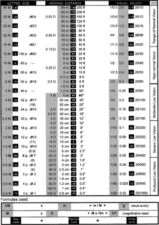 1/V = M × D = letter size (in M-units) × viewing distance (in diopters) Use of this modified Snellen formula has several advantages: