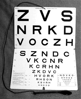 CHOICE OF CONTRAST AND ILLUMINATION. Contrast and illumination both influence visual acuity. Fortunately, in the range of commonly used values, this influence is minimal. If contrast is reduced to a level where it affects visual acuity, we speak of a contrast sensitivity test, which is discussed elsewhere. If illumination is lowered to threshold values, we may speak of a dark adaptation test. Visual acuity is usually not affected until contrast drops below 20%. Normal visual acuity charts have contrasts of 80% or better. For use in a routine eye examination, projector charts in a dim or darkened room are generally preferred. In the United States, the average projector chart has a luminance of about 85 cd/m2; European charts are generally brighter, up to 300 cd/m2. The lower luminance has the advantage that the pupil may be wider, so that refractive errors may be more obvious; the brighter charts have the advantage that they suffer less from stray light, which causes contrast degradation. The ICO Visual Acuity Measurement Standard23 recommends a range that includes both the lower and the higher values. To predict the everyday performance of patients, a lighted printed chart in a lighted room is preferred. Front lighting is easiest to implement. Back lighting of a translucent chart on a light box gives the most even and most reproducible illumination. The usual backlit ETDRS chart has an illumination level of about 200 cd/m2. For patients with conditions such as albinism or rod dystrophy, it should be possible to reduce the illumination, which may result in a significant increase in visual acuity. A presentation method, which undoubtedly will gain more widespread use in the future, is presentation on a computer screen. This allows presentation of single letters, as well as presentation in a letter chart format. It also allows control over parameters such as crowding, contrast, and brightness. CHOICE OF VISUAL ACUITY NOTATION. The result of the visual acuity measurement can be recorded in a variety of ways. True Snellen Fractions. The notation promoted by Snellen was that of a true Snellen fraction, in which the numerator indicates the actual test distance and the denominator indicates the actual size of the letter seen. The advantage of this notation is that it indicates the actual test conditions. The disadvantage is that it becomes awkward to compare visual acuity values measured under different conditions. This is especially true for projector charts, where the projector magnification is often adjusted to accommodate fractional viewing distances. Snellen Equivalents. To overcome this difficulty, Snellen equivalents are used. In Europe, the decimal equivalent of the Snellen value is used most often. This notation is clear because there is no numerator or denominator. The notation becomes confusing when the decimal notation is converted back to a pseudo-Snellen fraction. For example,5/25 = 0.2 = 2/10; the 2/10 fraction would suggest that the subject saw a 10 M letter at 2 meters, instead of a 25 M letter at 5 meters. In the US Notation, a 20-foot fraction is usually used as a Snellen equivalent. For example, in an examination lane of 18 or 21 feet, the true Snellen fractions would be 18/18 or 21/21. Instead, the visual acuity is recorded as 20/20 in both cases. Thus, seeing 20 as the numerator of a visual acuity fraction rarely implies that the actual measurement was made at 20 feet. In Britain, the 6/6 notation is similarly used as a Snellen equivalent. Visual Angle Notation was used by Louise Sloan. It refers to the visual angle of the stroke width of 5 × 5 letters. Thus, 1 minute equals 20/20 (1.0), 2 minutes equals 20/40 (0.5), and so forth. The visual angle is the reciprocal of the visual acuity value and equals the denominator of the 1-meter Snellen fraction. Others have used the acronym MAR. In the context of physiologic optics, this term is usually interpreted as “minimal angle of resolution” and best describes grating acuity; in the context of psychophysics and clinical testing it might be better interpreted as “minimum angle of recognition,” while in the context of vision rehabilitation it might be interpreted as “magnification requirement.” Because higher MAR values indicate poorer vision, MAR should be considered a measure of vision loss. LogMAR Notation was introduced by Bailey.31 As the name implies, logMAR is the logarithm of the MAR value, thus converting a geometric sequence of letter sizes to a linear scale. Like MAR, logMAR is a notation of vision loss, since positive logMAR values indicate reduced vision, while normal vision (better than 20/20, 1.0) is indicated by negative logMAR numbers. Standard vision (20/20, 1.0) equals 0. On a standard chart, each line is equivalent to 0.1 logMAR; thus + 1.0 logMAR means 10 lines lost or 20/200 (0.1), and + 2.0 logMAR means 20 lines lost or 20/2000 (0.01). Since Bailey used the logMAR notation with a geometric progression of letter sizes, the term logMAR chart is often used to imply a geometric progression. This is not necessarily so; a logarithmic scale could be applied to any progression. The decimal values and reverse scale do not make the logMAR notation particularly user-friendly. For everyday clinical practice, Snellen equivalents are easier, since they relate directly to the measured quantities of letter size and viewing distance. The logMAR notation has gained widespread use in psychophysical studies, for statistical calculations, and for graphical presentation of the results of multicenter clinical studies. It provides a more scientific equivalent for the traditional clinical statement of “lines lost” or “lines gained,” which is valid only when all steps between lines are equal. Visual Acuity Rating (VAR; Bailey42) and Visual Acuity Score (VAS; Colenbrander43) are two names given to a more user-friendly equivalent of the logMAR scale. On the VAR or VAS, 20/20 (1.0) is rated as 100, 20/200 (0.1) is ra