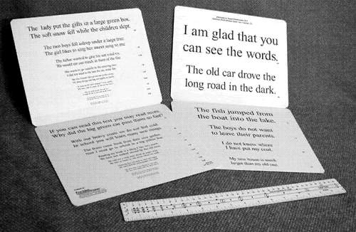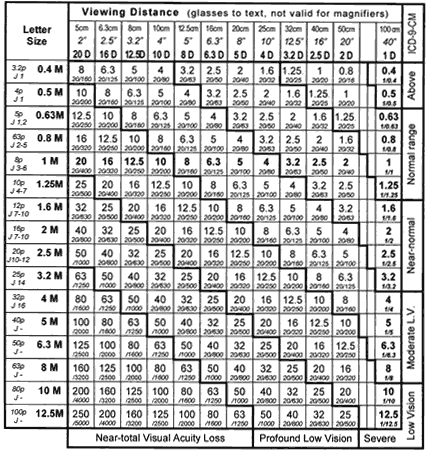 The HOTV test contains four symbols—H, O, T and V—also chosen because they have no characteristics that require a sense of laterality. To standardize the effect of contour interaction when the symbols are presented singly, they may be surrounded by crowding bars. Tumbling Es are probably the symbols most often used for the testing of children. They do require a sense of laterality, which can be a stumbling block for young and for developmentally delayed children. They can be presented in a chart format or as single symbols. When comparing findings, it should be remembered that presentation as single symbols is an easier test than presentation in a chart format. Comparison of these different conditions and of findings on a closer spaced chart may give insight in the importance of crowding and of lateral contour interaction, which can be particularly informative in the treatment of amblyopia. Tumbling Es also are the basis for the WHO low-vision training kits, which are widely used in developing countries and in countries where the Roman alphabet is not used. Landolt Cs22 have become the symbols of choice for many scientific measurements. They are much less frequently used in a clinical setting, except in Japan, where the characters of the Kanji alphabet are too complex. When used in a chart format, it is harder to detect errors unless the observer points to the symbol. However, pointing, like single presentation, affects the difficulty of the test. The Visual Acuity Measurement Standard of the ICO23 requires that letter charts in non-Roman alphabets (e.g., Cyrillic, Arabic, Hindi, Kanji, Hebrew) be calibrated against Landolt Cs for equal recognizability. Grating acuity is another visual acuity measurement that is used mostly in the laboratory and mostly in connection with contrast measurements. For infants it can be used on cards as a preferential looking test. Preferential looking is a detection test and thus not strictly equivalent to a recognition test. Summary When recording visual acuity for patients in the range of normal vision, the preferred measurement tool will often be a projector chart at 5 or 6 meters or 20 feet in a darkened room. The preferred notation will be a Snellen equivalent. In continental Europe this is most often decimal notation; in Britain it is the 6/6 equivalent; in the United States it is the 20/20 equivalent. When recording visual acuity for patients in the low-vision range, the preferred tool is a lighted chart in a lighted room at a distance of 1 meter. The preferred notation will be a true Snellen fraction with 1 as the numerator. It is often useful to add the commonly used Snellen equivalent in parentheses. Thus, the ability to recognize an 8 M letter at 1 meter would be recorded as 1/8 (20/160) or 1/8 (0.125). If the same patient were tested on an ETDRS chart at 4 meters, the notation could be 4/32 (1/8, 20/160). NEAR VISION MEASUREMENT Although the testing of reading vision predated the development of letter charts to measure distance vision, the methodology to accurately measure reading acuity has lagged behind. This is in part due to the fact that the prescription of a reading correction for normally sighted individuals is aimed more at achieving reading comfort than at accurate measurement. It is also due to the lack of accurate measuring tools. Reading distances are more often estimated than measured, while the “Jaeger numbers,” which are widely used in the United States, have no numerical meaning. Under these circumstances, it is not surprising that many practitioners believe that reading acuity and distance acuity have little in common. We will show that this is not so. As is the case for distance vision, accurate determination of near vision acuity requires measurement of two variables—letter size and viewing distance. For distance vision, the viewing distances are standardized, so that only the letter sizes vary. For individuals in the normal visual acuity range, reading distances may be standardized, but the standards vary. Some use 40 cm (16 inches, 2.5 D reading), or 14 inches (35 cm, 2.75 D), others use 33 cm (13 inches, 3 D) or even 30 cm (12 inches, 3.25) or 25 cm (10 inches, 4 D, the reference point for the power of magnifiers). Individuals in the low-vision range often need distances that are even shorter and certainly cannot be handled with a “one size fits all” distance. They need a formula in which both the letter size and the viewing distance can be varied easily. Modified Snellen Formula The standard Snellen formula, V = viewing distance ÷ letter size, becomes awkward to use when the numerator (viewing distance in meters) is itself a fraction within a fraction. This can be overcome by using the reciprocal value of the viewing distance. The reciprocal of a metric distance is known as the diopter (e.g., 2 D = 1/2 meter, 5 D = 1/2 meter).20 The traditional formula