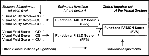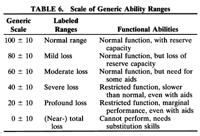 FUNCTIONAL VISION ESTIMATES Use of statistical ability estimates is meaningful only if a reasonable correlation can be established between visual function measurements and functional vision. Ophthalmology was one of the first fields in which attempts were made to establish such a correlation. Best known, although not the first, is the Visual Efficiency Scale developed by Snell in 1925. Snell did a survey establishing that persons with 20/200 (0.1) visual acuity had lost 80% of their employability in 1925.49 He combined this with a study about progressive visual blur to come up with a formula assigning a visual efficiency percentage rating to every visual acuity level.50 In the same year, his report was adopted by the AMA Committee on Compensation for Eye Injuries.51 In 1958, this report was one of several published as Guides to the Evaluation of Permanent Impairment.52 Several editions followed in which some additions were made but in which the basis of Snell's scale remained unchanged. This was the situation up to the 4th edition (1993) of the AMA Guides. The Visual Efficiency Scale can be found quoted in many publications. The AMA Vision chapter in the 5th edition of the Guides4 (2000) incorporates radical changes. The Visual Efficiency Scale has been replaced by the Functional Vision Score system. The major change is that 20/200 (0.1) visual acuity is no longer rated as an 80% loss (of employability in 1925) but as a 50% loss of the generic ability to perform ADLs. This statistical estimate, combined with individual factors such as specific job requirements, can then contribute to an administrative decision about the assignment of benefits, which is a separate step not covered by the AMA Guides. Other alterations in the 5th edition involve some changes in the rules for combining losses and the elimination of various inconsistencies that had crept in over the years. General Ability Score To compare performance across dissimilar abilities (e.g., reading ability, hearing ability, walking ability), a set of generic ability ranges is needed. A useful scale is shown in Table 6. It recognizes that most functions have reserve capacity. When the reserve capacity is lost, peak performance suffers, but average performance is still acceptable. When loss proceeds further, some assistive devices are needed to enhance the function (enhancement aids). When loss proceeds beyond the midpoint of the scale, performance is restricted and finally impossible. At some point, enhancement aids are no longer useful, and the patient needs substitution aids to replace the lost function (e.g., talking books instead of magnifiers, lip reading instead of a hearing aid, a wheelchair instead of crutches).