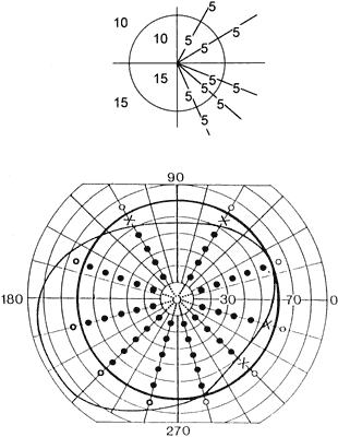 Converting a visual acuity value to a VAS converts the geometic sequence of visual acuity values to a linear scale that can be used for averaging and for other calculations. In the process outlined in the new AMA Guides, this is the first of three steps. The second step is to derive a statistical estimate of the acuity-related abilities of the person. This is done by calculating weighted average of the scores obtained for the right eye, the left eye, and binocularly. Since normal vision is binocular vision, the binocular score receives 60% of the weight; the right eye and left eye receive 20% each. Thus, the formula is FAS = (3 × VASOU + VASOD + VASOS) ÷ 5. The result is called the Functional Acuity Score (FAS). The last step is to combine the FAS with a similarly derived functional field score (FFS) to a single functional vision score (FVS), as indicated in Figure 18. Visual Field Score A similar scoring system can be developed for visual field loss. While visual acuity loss may manifest itself primarily in a loss of reading ability, visual field loss affects another set of ADL skills, commonly covered under the term orientation and mobility (O&M) skills. The importance of these skills is obvious, but designing a good measurement tool for O&M skills is difficult. The technical aspects of visual field measurement have been discussed elsewhere. Modern static perimetry plots are a great help in defining the underlying disorder; they are harder to interpret with regard to the functional consequences. Traditional Goldmann isopters were easier to interpret in this regard. Also, for diagnostic purposes, the central 30 degrees are the most informative, whereas a full-field plot is needed to predict O&M skills. Capturing all aspects of visual field loss in a single number is a serious oversimplification of a complex reality. Nevertheless, it has been attempted because of administrative demand. The old AMA Guides offered two options: a formula-based calculation and use of overlay grids. The formula gave equal weight to the upper and lower field and to peripheral and central loss. The overlay grids, designed by Esterman,53–55 gave double weight to the lower field and concentrated most weight in the Bjerrum area. The two methods do not give the same result and differ from the traditional legal blindness criterion (20-degree diameter, 10-degree radius). The new AMA Guides use a method that can be implemented with paper and pencil or with an overlay grid and that has the potential of being implemented on an automated perimeter.56 Fifty points are assigned to the central 10-degree radius (20-degree diameter), since this area corresponds to about 50% of the primary visual cortex; the other 50 points are assigned to the periphery. The points are arranged along 10 meridians, 3 in each of the lower quadrants and 2 in each of the upper quadrants. This gives the lower field 50% extra weight. Measuring along meridians within the quadrants, rather than along the principal meridians, avoids special rules for hemianopias. Along each of the 10 meridians, 5 points are counted from 0 to 10 degrees and 5 points from 10 to 60 degrees. This maintains the traditional equivalence between a visual acuity loss to 20/200 (0.1) and a visual field loss to 10 degrees, and assigns 100 points to a field of 60-degree average radius. The assignments are summarized in Figure 19. Similar to the VAS, which can be calculated as the number of letters read on a standardized chart, the visual field score (VFS) can be calculated as the number of points seen on a standardized grid. Table 7 compares the VAS with ranges of reading skills and the VFS with ranges of O&M skills. There is reasonable agreement, indicating that the VFS is a reasonable estimate of O&M ability. The next step is to combine the VFSs obtained for the right eye, left eye, and binocularly to obtain a statistical ability estimate: the FFS. As for the FAS, this is done by averaging. The formula is FFS = (3 × VFSOU + VFSOD + VFSOS) ÷ 5. The binocular visual field is not measured directly but constructed by superimposition of the monocular fields. Combining Visual Acuity and Visual Field Values After the FAS and the FFS have been calculated, they can be combined to a single FVS for the whole person. The formula is FVS = (FAS × FFS) ÷ 100. The process is summarized in Figure 18. For more detailed rules, refer to the AMA Guides.4 |