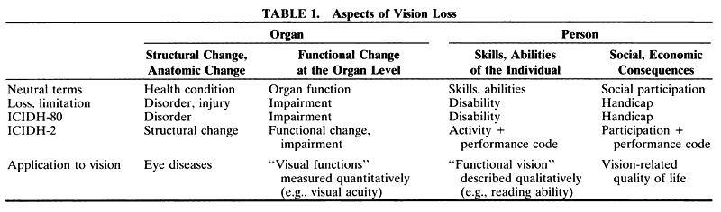 FUNCTIONAL VISION This aspect reaches beyond the description of organ function by describing the skills and abilities of the individual. It describes how well the individual is able to perform ADLs given the vision loss. This aspect has been described under different names. In the field of vision, the term functional vision is used. In ICIDH-802 loss (or lack) of ability was described as disability. Its successor, ICIDH-23 provides a taxonomy of activities and of the ability to perform them. The use of the term disability is discouraged since it can have different meanings in different contexts. (Having a disability may be a synonym for having an impairment; being disabled points to a loss of ability; being on disability points to an economic consequence.) In the AMA Guides to the Evaluation of Permanent Impairment4 the term impairment refers to organ function, and impairment rating refers to an estimate of the ability to perform activities of daily living. SOCIETAL AND ECONOMIC CONSEQUENCES The last aspect describes the societal and economic consequences for the individual caused by an impairment or by a loss of ability. In ICIDH-80 this aspect was described as handicap and measured in terms of loss of independence; in ICIDH-2 it is described under the heading Participation. Handicaps do not preclude participation. The story of Helen Keller is one example of how some people can achieve full participation despite extraordinary handicaps. MEASUREMENT The different aspects are measured in very different ways. Visual functions are measured with clinical tests, such as a letter chart, a tangent screen, or a color test. Functional vision is assessed by the ability to perform generic ADLs. Different impairments have different effects. Visual acuity loss affects activities such as reading ability and face recognition. Visual field loss manifests primarily by difficulties in orientation and mobility (O&M) tasks. The participation aspect looks beyond the ADL abilities to the actual environment. How well is the individual able to hold a job and to earn a living? What “reasonable accommodations” are mandated by stat-utes such as the Americans with Disabilities Act(ADA)? Do difficulties in face recognition limit a person's social activities? This aspect is not limited to generic daily living skills but can consider the effect of specific environmental conditions and demands. Uncorrected myopia, for instance, would be a severe handicap for a hunter but might be an asset for a watchmaker. REHABILITATION Improving the participation aspect is the ultimate goal of all medical and social interventions. There clearly are links between the aspects: a disorder may cause an impairment, an impairment may cause a loss of abilities, a loss of abilities may cause a lack of participation. However, these links are not rigid. Medical and surgical interventions can reduce the impairment caused by a disorder. Assistive devices may improve abilities in the face of a given im-pairment. Changes in the human and physical en-vironment may increase participation, regardless of reduced abilities. The art of rehabilitation is to manipulate each of these links so that a given disorder results in the least possible loss of participation. The outcome of various interventions must be measured in different ways. Visual acuity measurement is useful as an outcome measure for medical and surgical interventions but cannot be used to measure the outcome of rehabilitative interventions. Rehabilitative effects must be judged by an improved ability to perform ADLs. This can be expressed in an ability profile. This chapter will pay much attention to visual acuity and visual acuity measurement. The reader should keep in mind, however, that visual acuity is only one of many organ functions and that organ function is only one of the many aspects of vision loss. Particularly among the elderly, measuring functions such as contrast sensitivity, glare sensitivity, and vision at low luminance may reveal deficits that are missed by the usual visual acuity measurement at high contrast.5 |