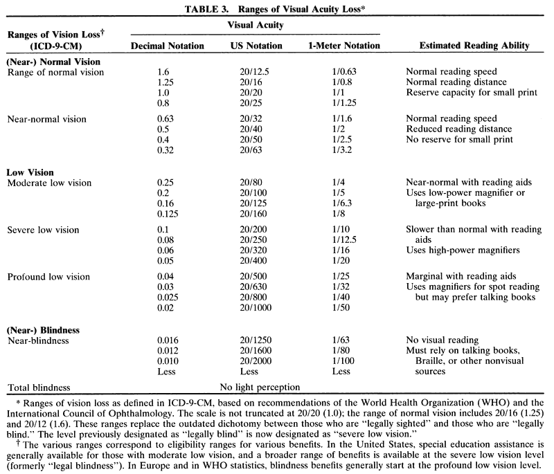 DISTANCE VISION Ranges of Vision Loss Vision loss is not an all or none phenomenon. Since the 1970s, the WHO has recognized this by replacing the simplistic dichotomy between those who are considered legally blind and those who are considered legally sighted with a set of ranges. In ICD-928 and ICD-9-CM,30 the range of low vision took its place between the ranges of normal (or near-normal) vision and blindness (or near-blindness). The word low indicates that these individuals do not have normal vision; the word vision indicates that they are not blind. The ranges used in ICD-9-CM are listed in Table 3.
