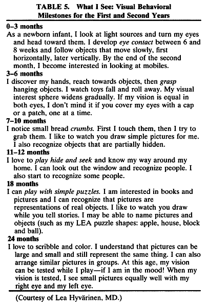 When the reading time is recorded for each print size, the usual pattern is that the subject reads at a reasonably stable rate at larger print sizes. At smaller sizes, reading becomes slower and then impossible (fast—fast—slow). The print size just before the reading speed starts to drop off is the critical print size. Providing magnification of ordinary print to the critical print size will give the best reading performance with the least magnification (largest field of view). Some subjects show a pattern that can be characterized as slow—fast—slow. This pattern occurs when macular degeneration patients read in a small island of vision within a pericentral scotoma. For large text, the island is not large enough to cover a whole word; this slows reading down. At medium print sizes, more letters are covered and reading speeds up. At the smallest sizes, reading slows down again. The same pattern can be seen in patients with extreme tunnel vision in end-stage glaucoma or retinitis pigmentosa. In these cases, it is important not to prescribe too much magnification. Using the underlining technique to facilitate tracking along the line may also be beneficial. Occasionally, the pattern is slow—slow—slow. This pattern, which can be seen in patients with scattered drusen, indicates that magnification alone will be of limited benefit. In these patients, other means, such as underlining to facilitate tracking, together with training and practice in the most effective use of the available retinal areas can lead to more improvement than magnification alone. Infant Vision Testing In infants, both the physical basis of visual acuity and the cognitive skills to use it are still developing. Standard visual acuity testing is impossible, yet early detection of deficits is extremely important. Not acting on a suspicion of vision loss may cause developmental delays, since it deprives the infant of its most abundant source of stimulation. Instead of adult vision testing techniques, we must use behavioral observations. The list in Table 5, supplied by Lea Hyvärinen, provides a transition to the discussion of the next aspect of vision loss: functional vision.