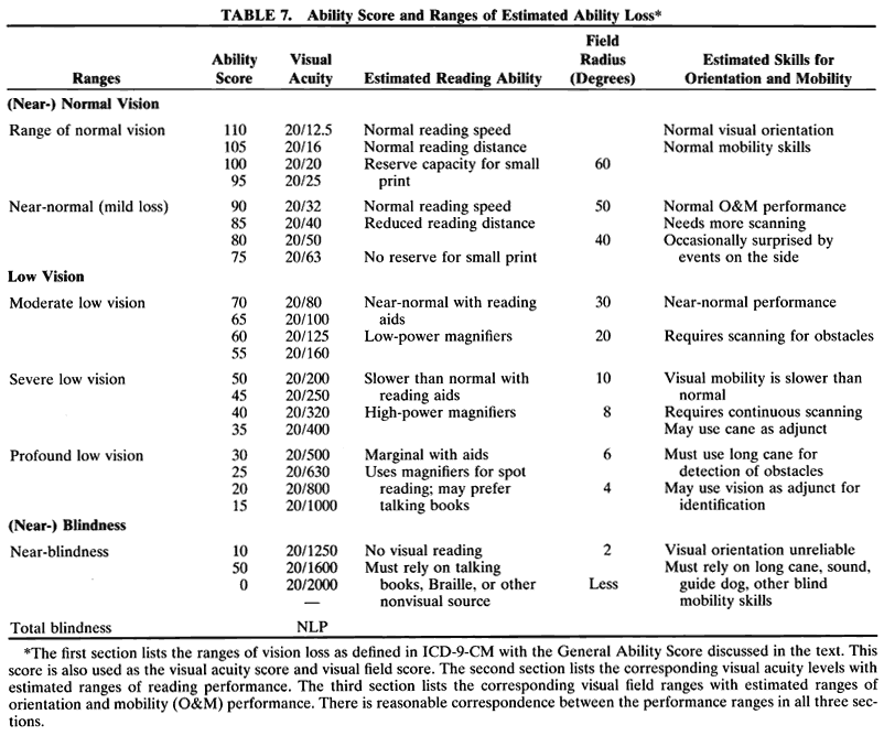 Visual Acuity Score In Table 3, the set of ICD-9-CM visual acuity ranges was compared with a set of reading ability ranges. We found a good fit. The VAS, discussed under visual acuity notations, fits equally well with the visual acuity ranges as with the General Ability Scale quoted above. We may conclude that the VAS (Table 7) provides a reasonable statistical estimate of the generic ability to perform tasks requiring detail vision.