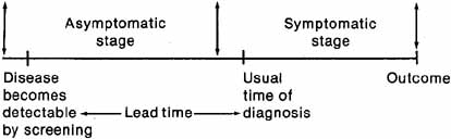 The rationale for each criterion is discussed below. Morbidity and Mortality A condition merits screening only if it has an important public health impact and is serious enough to affect the quality or quantity of life. Prevalence Ideally, screening should be aimed at detecting relatively common conditions within the population targeted. As the prevalence of a condition increases in the target population, screening yields more cases and the cost per case detected decreases.9 Natural History Knowledge of the course of the disease process is essential for screening.10 In some conditions, there is a marked overlap in measurements between diseased and nondiseased persons, and the diagnosis is not clear cut. To be suitable for screening, a disease must have a clearly recognized biologic onset and a diagnosis that can be confirmed by accepted criteria. The disease should also have a latent, asymptomatic stage before it becomes clinically apparent (see Fig. 1). The presence of this asymptomatic stage will permit detection and intervention before the usual time of diagnosis. The time lapse between early detection by screening and the usual time of diagnosis is known as the lead time.8,11
