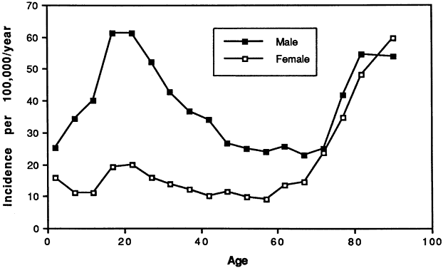 AGE High rates of ocular injury in young adults have been observed consistently in nearly all descriptive7,14,15,25 and controlled epidemiologic studies.10–12,17,22,33 This high incidence reflects a high proportion of work-, assault-, sports-, and motor vehicle crash-related ocular injuries in the young adult age groups, particularly among young men. However, hospital discharge data on ocular injuries in Maryland and in the United States suggest that a substantially higher than average risk of trauma occurs in the elderly as well.10,11 The age and gender pattern observed in Maryland is characteristic of the epidemiology of ocular trauma (Fig. 1) and reveals two important features. The age-incidence curve is bimodal for both males and females, with a well-recognized peak in incidence from about 18 to 25 years of age and an additional peak after age 70. For females, this peak in incidence after age70 is three times higher than the peak in young adulthood, but the peak in elderly men is similar to that observed for men in their twenties. This higher incidence among the elderly is also observed nationally11 but is not usually reflected in other studies because either all elderly are grouped over age 60 or 65, or because small sample sizes preclude accurate estimation in this age range.9,13,16,30,35 GENDER The second unique epidemiologic feature of ocular trauma is that the higher risk among men occurs across the full age range until age 70, when the gender-specific curves merge. The higher risk among men has been found in every population-based study of ocular injuries, with incidence or prevalence ratios (male:female) from two to greater than five.9–11,13,16,17,24,30,35 This difference between men and women disappears after the age of 70, and may be related to a change in lifestyle and occupational patterns among men after this age. RACE AND SOCIOECONOMIC STATUS Racial variations in rates of ocular injury have been observed but likely reflect variations in socioeconomic status and not race alone. In Maryland, nonwhites had higher rates of hospitalization for ocular injury overall, with a 40% to 60% higher risk compared with whites between the ages of 25 and 65.10 Higher rates were also observed in the Baltimore Eye Survey data for injuries associated with vision loss. African American men had rates of ocular injury three or four times higher than those of white men, whereas African American women had rates between 30% and 90% higher than those of white women, depending on the severity of vision loss.17 In Brazil, children from lower socioeconomic strata were found to have higher frequencies of ocular trauma compared with those from higher socioeconomic strata.36 |