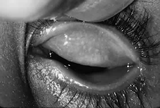This simplified system is in widespread use but can result in overdiagnosis of trachoma. Two examples occurred in Nepal: in Eastern Nepal, TF (five or more follicles on the central tarsal conjunctiva) was diagnosed in 22% of children and TI (intense papillary reaction of the tarsal conjunctiva) in 6.7% but no trachomatous scarring could be detected. The investigators correctly judged that without scarring, there was no need to intervene for trachoma.35 Our group found a similar situation in Western Nepal, with 7% of children with TF and 1% with TI; despite the occurrence of severe scarring and trichiasis in older adults, no chlamydial agent was found by a sensitive DNA amplification test, indicating that the follicular conjunctivitis was not active trachoma (T. Lietman, personal communication). In such situations, other signs (conjunctival scarring or Herbert's pits) are needed to definitively diagnose trachoma. In the older MacCallan classification, trachoma cases are classified in stages by the findings in the conjunctiva alone.1 This classification describes the evolution of the disease but does not have prognostic value. Trachoma stage I and stage II are the early and established phases of inflammatory trachoma, with lymphoid follicles and papilla but without conjunctival scarring. Stage IIA is characterized by mature (i.e., large necrotic follicles) and stage IIB by papillary hypertrophy that has obscured the follicles and underlying tarsal vessels (P3 or severe intensity). In stage III, conjunctival scarring is present with the conjunctival signs of stages I or II. In stage IV, the acute inflammatory signs of the conjunctiva found in stages I and II have resolved, leaving scars in the conjunctiva. If sufficiently severe, these scars can contract further to produce lid distortion and trichiasis. In stage IV, the disease was thought to be noninfectious but the newer diagnostic tests frequently identify chlamydial infection in these putatively healed cases. The MacCallan classification does not describe the degree of inflammation or identify cases with visually disabling lesions and hence is not as useful for prognosis as the newer classification. Communities with blinding trachoma can be recognized by the presence of those with severe visual loss due to corneal opacity and a substantial prevalence of potentially disabling trachomatous lesions, particularly trichiasis or entropion. These irreversible changes appear as the long-term outcome of prolonged or recurrent inflammatory disease of moderate or severe intensity. Communities with nonblinding trachoma may have a low prevalence of potentially blinding lesions but do not have a substantial prevalence of trachomatous visual loss. In some areas where living standards have improved, trachomatous trichiasis and corneal scarring affect many adults but active inflammatory trachoma in children is relatively mild. In this setting, trachoma control programs should emphasize surgical correction of inturned lids but the need for community-wide antibiotic treatment should be based on the prevalence and severity of conjunctival scarring in children younger than 10 years, in addition to the prevalence of inflammatory trachoma. In communities with trachoma, infection by C. trachomatis is always present but other ocular microbial pathogens appear to contribute significantly to the intensity of trachoma and probably to the lesions that impair vision.3,7,8 CLINICAL DIAGNOSIS If there is uncertainty concerning the presence or absence of trachoma in a given community or area, it is essential to use strict diagnostic criteria to identify those with trachoma.1 For this purpose, individual cases must have at least two of the following signs: