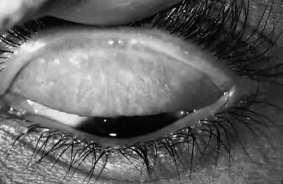 This scar formation also affects the canaliculi and lacrimal duct with obstruction and cutaneous fistula.33 Occlusion of the tear outflow can cause tearing and often leads to the development of dacryocystitis in adult life. Linear scars that form just adjacent to the lid margin are particularly damaging because of the lid distortion that they cause. Cicatricial changes occur throughout the conjunctiva but are most apparent and damaging on the tarsal conjunctiva. One result of extensive scarring is that destruction of goblet cells occurs in severely scarred eyes, with a loss of mucus secretion. The loss of mucus and distortion of the upper lid lead to inadequate surface wetting of the cornea. The drooping or half-closed lids in active trachoma have been attributed to the weight of the lid, to inflammatory involvement of Müller's muscle in the upper lid, and to reflex blepharospasm caused by keratitis-induced photophobia. In late cicatricial trachoma, there may also be destruction of Müller's muscle. The major potentially blinding sequela of trachoma are distortion of the lids, particularly the upper lid; trichiasis (misdirection of individual lashes); and entropion (inward deformation of the lid margin; Fig. 6).1 Severe conjunctival scarring from trachoma can lead to defects in lid closure and loss of the mucus in tears, with inadequate surface wetting of the cornea. The abrasion of the cornea by wiry lashes—especially when aggravated by even minor foreign-body injury or by inadequate wetting of the cornea—can further predispose the cornea to traumatic and infectious damage.