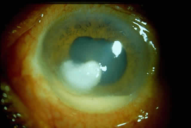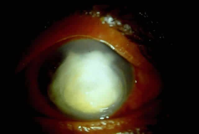 Fungal keratitis is as frequently seen as bacterial keratitis. Aspergillus and Fusarium are the two most commonly isolated organisms. Predisposing factors include trauma, foreign body, and injudicious usage of topical steroids or other indigenous medications. Delay in diagnosis, the relative ineffectiveness of antifungal agents in most parts of the world, and the nonavailability of these drugs hinder prevention and management (Fig. 3).
