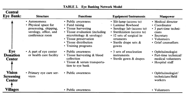 MODEL FOR EYE BANKING Since most people in developing countries live in rural areas with limitations in communication and transportation, eye banking in these countries needs modification. One of the concepts being developed is presented here (Table 2).