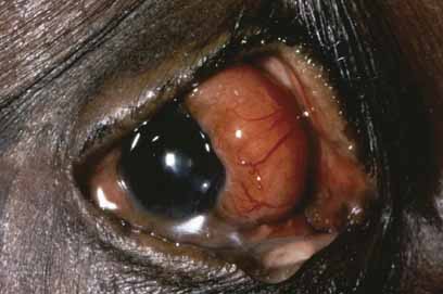 Corneal lepromas (Fig. 4) occur more commonly in South America50 and Japan51 but are relatively infrequent. These lesions are large granulomas with epithelioid cells, lymphocytes, and bacteria. They may become large enough to involve the visual axis and compromise vision. Lepromas usually arise at the limbus (most commonly the lateral limbus) or on the sclera and then encroach onto the cornea. Interstitial keratitis begins in the superior temporal quadrant or in the superior quadrants. It is probably a more severe form of the avascular keratitis, with necrosis and then vascular invasion. Interstitial keratitis may begin without a preceding avascular keratitis in the midstroma of the cornea (superior nasal quadrant) or as a discoid lesion often located superiorly. The interstitial keratitis may progress to involve the visual axis (Fig. 5), with a decrease in visual acuity. Ghost vessels are occasionally seen in mid- to deep stroma in interstitial keratitis, indicating previous inflammatory activity. SCLERAL AND UVEAL LESIONS Episcleritis, scleritis, and uveitis are the initial presenting complaints in up to 16% of leprosy patients.52 The nodular episcleritis that occurs consists of focal leproma with surrounding inflammatory response. There are also more diffuse forms of episcleritis. Episcleritis commonly occurs as part of the ENL reaction, and may be associated with iridocyclitis. Lepromas may occur in the interpalpebral fissure more commonly because this area is cooler. The episcleritis and scleritis may be the result of direct bacillary invasion, but there is strong evidence that some cases may be mediated by immune responses, such as the deposition of immune complexes. Chronic or recurrent scleritis in leprosy may result in scleromalacia and staphyloma (Fig. 6) and, in some cases, disorganization of the globe. Uveitis in leprosy may be the result of several different mechanisms. Uveitis with the erythema nodosum leprosum reaction probably results from a hypersensitivity reaction (probably antigen-antibody mediated)25 and usually occurs with therapy or occasionally after termination of therapy. This iridocyclitis, which also occurs spontaneously, has an abrupt onset and fulminating course with hypopyon, posterior synechiae, and elevated intraocular pressure. Occasionally, there is a spontaneous hyphema presumably because of fragile vessels from previous attacks. This granulomatous uveitis is usually associated with greasy, keratic precipitates. There is also a chronic, low-grade uveitis seen commonly in lepromatous leprosy, which is the principal cause of blindness in ocular leprosy.33,34 This insidious anterior uveitis causes gradual iris atrophy as manifested by loss of iris stroma with a moth-eaten appearance, frank iris holes (Fig. 7), and small, nonreactive pupils. In this condition, iris stromal nerve involvement and disintegration of iris stroma associated with leprosy bacilli can be demonstrated histologically.53 In this “white” iritis, patients have few anterior chamber cells and mild to moderate anterior chamber flare with minimal ciliary flush or conjunctival injection. There are a few scattered, fine, white keratic precipitates. Posterior synechiae are not common and, when present, may be the result of a previous attack of acute iritis. The dilator muscle is affected earlier and to a greater extent than the sphincter muscle, resulting in a small, nonreactive pupil.54 The pinpoint pupil may lead to marked visual loss if there is a corneal or lens opacity. This chronic, low-grade uveitis is more common in patients with lepromatous leprosy, although it may be present in those with tuberculoid leprosy.35 Iris pearls arise from the surface connective tissue of the iris and can be recognized on the iris surface even early in the disease (Fig. 8). These creamy white particles consist of bacilli and monocytes and are rarely associated with an inflammatory response.49 Iris pearls are pathognomonic of ocular leprosy and look like grains of sand on the iris surface, often occurring near the pupillary border. After several years, they may coalesce and drop into the inferior angle, where they can be observed by gonioscopy. Pearls have been reported on the retina55 but probably represent the migration of such spheres to the posterior segment rather than formation there.
