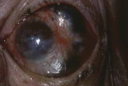 EXTERNAL ADNEXAL TISSUES Brow loss is one of the most common manifestations of leprosy41–43 and occurs more frequently in the tuberculoid form (Fig. 1). Brow loss begins temporally and progresses nasally, perhaps because the temporal brow is somewhat cooler. Madarosis, or eyelash loss, is also common, affecting the lower lid before the upper lid. The severity of both brow loss and madarosis is related to the duration of disease.44 Seventh cranial nerve paralysis is common and results in lagophthalmos and ectropion of the lower eyelid (see Fig. 1). When fifth-nerve involvement also occurs, a marked form of anesthetic corneal exposure may result. It has been believed that inflammation caused by leprosy may cause upper lid entropion,43,45 but trachoma is often endemic in these populations so the upper lid deformity may often be caused by trachoma. Unfortunately, multibacillary patients develop paresis later in their disease when they often have corneal sensory loss. These patients have little urge to blink, nor can they effectively blink when they try. Such patients are at high risk for corneal ulceration, and surgical intervention should be considered early. Eyelid nodules, ENL, and erysipeloid reactions of the lid are recognized less frequently, probably because they occur less frequently, or perhaps because they are transient. Loss of skin elasticity, infiltration of the marginal and pretarsal fibers of the orbicularis oculi muscle by M. leprae, and loss of muscle tone contributes to dermatochalasis and heavy, drooping upper lids (see Fig. 1). Further atrophy at the canthal tendons and tarsal plates create heavy, floppy lids allowing ectropion or perhaps entropion, and trichiasis. Meibomian gland infiltration leads to atrophy and an inadequate lipid production with associated tear dysfunction. Leprosy involves the lacrimal gland by causing denervation of the lacrimal gland that helps to contribute to a dry-eye syndrome. Leprotic dacryocystitis secondary to nasal disease is a common complication, and may contribute to subsequent corneal ulceration and microbial keratitis. CORNEAL AND CONJUNCTIVAL INVOLVEMENT Exposure keratitis occurs frequently in patients with leprosy. Seventh cranial nerve involvement with lagophthalmos results in exposure keratitis inferiorly. Fifth cranial nerve involvement with an anesthetic cornea and decreased blinking also contributes to the problem. Patients may inadvertently traumatize themselves by rubbing their eyes with calloused, insensitive, and often infected fingers (Fig. 2). This constant exposure is often combined with lid deformities (trichiasis) so that corneal ulceration and secondary bacterial infection are frequent events.46 These ulcers may perforate, leading to phthisis and blindness. Even when the corneal ulcer heals, there is stromal scarring and thinning. Corneal hyposensitivity or anesthesia is seen more commonly in lepromatous leprosy, and is coincident with more severe complications.47