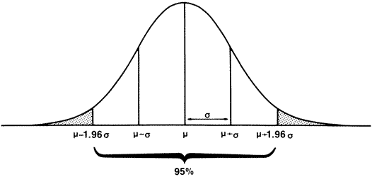 The importance of understanding the distribution of a particular set of data is twofold. Not only is it a way of taking a large collection of disorganized observations and condensing the information into a cohesive and understandable format, but recognizing the underlying distribution of the data is essential to choosing appropriate methods of analysis. Once the general form of the distribution is decided on, we can proceed either to describe the data in more detail or to make inferences from what we see. In clinical ophthalmology, statistics is primarily used for inference. However, a simple example from descriptive statistics best illustrates the usefulness of parameters of a distribution. Because so many measurements of human beings are take a normal distribution, this distribution is sometimes assumed without specification in statements such as “the normal intraocular pressure is 15.5, with a standard deviation of 2.6.” Statistics provides a more exact mathematical way to say, “most people have IOPs of around 15.” In particular, it gives a precise definition of “around 15,” which can be important, for example, for interpreting an intraocular pressure of 18 (still in the middle part of the distribution) or 35 (in the far right tail of the distribution). STANDARD DEVIATIONS AND STANDARD ERRORS The standard deviation is a very simple concept. Figure 3 shows a normal curve with its mean and standard deviation. Notice that the line describing the normal curve is concave downward in the middle and concave upward toward each end. The point of inflection (point at which the curve reverses) is one standard deviation away from the mean (middle) of the curve. The standard deviation, usually denoted with a lower case sigma (σ), is a simple way of describing how “scattered out” the observations are. The standard deviation has other useful characteristics for Normally distributed variables. Approximately two thirds of the values lie within one standard deviation of the mean (in the example above, intraocular pressures between 12.9 and 18.1). Ninety-five percent of the values fall within approximately two standard deviations of the mean (1.96 standard deviations, to be exact). This means that there is a good mathematical reason to categorize as “high” a value that is more than two standard deviations above the mean. Only two and a half percent of individual values in a normal distribution are this far above the mean. Conversely, a value two standard deviations (or more) below the mean of a normal distribution can reasonably be defined as “significantly” low. In Figure 3, the shaded area represents all observations at least 1.96 standard deviations away from the mean in either direction. This is an important point to remember, because it is the basis for many statistical tests. Because the curve is symmetric, 2.5% of observations lie more than 1.96 standard deviations above the mean (“in the right tail”) and 2.5% are at least this distance below the mean, or in the left tail. The standard deviation of a distribution is denoted with a lower case sigma (σ). (Statisticians are also interested in the square of the standard deviation, called the variance of the distribution, but discussion of the latter statistic is beyond the scope of this chapter.) |