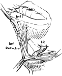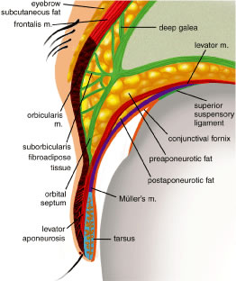 Some surgeons consider the lower eyelid to have three fat pads.9,23 A medial fat pad is subdivided by the origin of the inferior oblique muscle. Temporally, a small fat pad lies inferior to the lateral canthus and is separated from the main fat pad by a fibrous extension of connective tissue from the orbital septum and periorbita that joins with the capsulopalpebral fascia (CPF) and Lockwood's ligament.24 Because the eyelid fat pads are in direct communication with the deep extraconal fat of the orbit, caution must be exercised when handling orbital fat in the anterior orbit. Traction on the fat pad may injure deep orbital vessels causing orbital hemorrhage and permanent loss of vision.19,25 The midfacial fat compartments include the suborbicularis oculi fat (SOOF) and malar fat pads. These fat compartments are bound to the orbicularis muscle by the superficial muscular aponeurotic system (SMAS) of the cheek. The SOOF is composed of the deep subcutaneous fat and connective tissue, which is located beneath the orbicularis muscle in the lower eyelid and extends into the midface. In the aging lower eyelid, eyelid tone decreases with associated skin and muscle laxity. Horizontal laxity of the lower eyelid increases, and pseudoherniation of orbital fat may result in contour irregularities. The SOOF can become apparent with the gravitational descent seen in the midface with aging and contributes to the aesthetic deformity of the lower lids. Malar bags may also develop from descent of the malar fat pad. A SOOF lift is a technique used for midfacial rejuvenation that includes subperiosteal dissection of the SMAS to elevate the SOOF and redraping the orbicularis muscle to reposition the midface.26 Recent emphasis has been placed on a SOOF lift for midfacial rejuvenation surgery in conjunction with a lower eyelid blepharoplasty and lateral canthoplasty.27 The SOOF lift has also been used for functional repair of lower eyelid deformities seen in patients with significant involutional or cicatricial ectropion. Asian eyelids characteristically have a fuller appearance than the eyelids of Caucasian individuals. Upper eyelid fullness in the Asian person is typically caused by extension of preaponeurotic fat and brow fat into the upper eyelid. A recent study by Carter and colleagues28 used high-resolution magnetic resonance images to compare Asian and Caucasian lower eyelids. The study revealed two major differences in the lower eyelid anatomy: (1) there is more anterior projection of orbital fat with respect to the orbital rim in the Asian eyelid as compared with whites and (2) there is a more superior projection of orbital fat that extends to the inferior border of the tarsus with poorly defined eyelid creases in Asians. RETRACTORS The eyelid retractor muscles include the LPS muscle and the superior tarsal muscle, called Muller's muscle, in the upper eyelid and the CPF and the inferior tarsal muscle (ITM) in the lower eyelid (Fig. 15). The LPS is a skeletal muscle, whereas the ITM and Muller's muscle are both composed of smooth muscle. The action of the LPS is to elevate the upper eyelids. The oculomotor nerve (third cranial nerve) provides the motor innervation of the LPS. The superior division of the oculomotor nerve enters the orbit through the supraorbital fissure and the annulus of Zinn. It passes around the medial border of the superior rectus muscle to pierce the undersurface of the LPS at its posterior 1/3 anterior 2/3 junction, which is 12 to 13 mm from the orbital apex. Muller's muscle and the ITM are sympathetically innervated and also act to open the upper and lower eyelids.