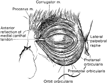 THE SKIN The eyelid skin is composed of a thin dermis and contains little subcutaneous fat.9 It is very elastic and is one of the thinnest of the body. It is loosely adherent to the underlying orbicularis oculi muscle. The skin of the upper eyelid is thinner than that of the lower eyelids. In later years, the skin becomes redundant. The excess skin provides an excellent source for skin grafting for eyelid reconstruction. There is a marked transition from the thin eyelid skin to the thicker skin of the eyebrow and cheek. The redundancy and elasticity of the eyelid skin and other eyelid structures allows for primary closure of fairly large defects (up to 30% of the eyelid in older adult patients). Upper eyelid skin laxity increases with age. This is called dermatochalasis. Dermatochalasis may progress and cause hooding, which results in mechanical ptosis that constricts the superior visual fields, or cause a mechanical upper eyelid entropion. Prominence of the lower eyelids may result from prolapse of the orbital fat, malar bags, or hypertrophic or overriding orbicularis oculi muscle. Excising excessive amounts of skin from either the upper or lower eyelids can create lagophthalmos or frank ectropion. Transverse eyelid creases are present in both upper and lower eyelids, measuring 8 to 10 mm above the upper eyelid margin and 4 to 5 mm below the lower eyelid margin.3 The upper eyelid crease, more specifically called the superior palpebral crease, represents the cutaneous insertion of fibers of the levator aponeurosis into the preseptal orbicularis oculi, which is usually the site of the eyelid fold. The upper eyelid fold refers to the roll of skin overlying the eyelid crease. Absence of an eyelid crease implies lack of LPS function, such as seen in congenital blepharoptosis. Dehiscence of the levator aponeurosis from its insertion on the tarsus, as seen in involutional ptosis, may also result in an elevated eyelid crease. Insertions of the levator aponeurosis into the preseptal orbicularis oculi and dermis are either weak or absent in the Asian eyelid. The anatomy of the Asian eyelids is discussed later in the chapter. The region between the upper eyelid crease and the superior orbital margin is referred to as the superior orbital sulcus. Loss of orbital volume following enucleation or atrophy of orbital fat as seen with aging may result in a concavity of the superior sulcus skin and muscle. The lower eyelid has three creases (Fig. 5). The inferior palpebral crease is a true crease marking the inferior edge of the tarsus and the insertions of the lower eyelid retractor muscles. The other two creases are less well defined and are the nasojugal crease inferomedially and the malar crease inferior to the lateral canthus, which marks the junction of the orbicularis muscle and the malar fat pad. These topographic landmarks demarcate the inferior border of the lower eyelid. EYELID MARGIN The upper and lower eyelid margins are composed of several identifiable structures (Fig. 6). The lash line is the most anterior line found along the eyelid margin, which is the site of origin of the cilia. Approximately 100 to 150 cilia are found in the upper eyelid, and approximately 50 to 75 cilia are in the lower eyelid. The eyelashes arise from hair follicles on the anterior surface of the tarsus and project outward, anterior to the eyelid margin. Both meibomian glands and eyelashes differentiate during the second month of gestation from a common pilosebaceous unit. Congenital distichiasis can result from poor differentiation, because an extra row of lashes arises from the meibomian orifices. A lash follicle may also develop from a meibomian gland following trauma in certain disease states, or with chronic irritation, leading to acquired distichiasis.10 Each hair follicle contains approximately two sebaceous glands called glands of Zeis. Sweat glands, or glands of Moll, also lie near the cilia and empty into the adjacent follicles. Glands of Moll and Zeis secrete lipid that contributes to the superficial layer of the tear film and slows evaporation.9 Posterior to the lash line and anterior to the tarsus on the eyelid margin is the gray line. The gray line is also referred to as the muscle of Riolan and represents the pretarsal orbicularis muscle on the eyelid margin.11 An incision posterior to the gray line along the eyelid margin demarcates the anterior lamella from the posterior lamella of the eyelid. The meibomian glands and tarsus comprise the layer of the eyelid margin located immediately posterior to the gray line and is part of the posterior lamella. The meibomian glands are arranged vertically within the tarsus with their orifices at the marginal surface. A mucocutaneous junction is located posterior to the meibomian gland orifices on the eyelid margin. The lacrimal puncta are also visible on all four eyelids near the medial canthal angle. The puncta represent the opening from the eyelid margin into the ampulla and canaliculi, which is the beginning of the lacrimal drainage apparatus. The lacrimal drainage system is described later in the chapter. THE ORBICULARIS OCULI MUSCLE The orbicularis oculi muscle is a thin sheet of concentrically arranged muscle fibers covering the eyelids and periorbital region. It is the main protractor of the eyelids and its primary function is narrowing of the palpebral fissures and closure of the eyelids. It also plays a role in the lacrimal pump system. The orbicularis oculi muscle is innervated by the facial nerve, and although it is a skeletal muscle, it is under voluntary, as well as reflex, control.12 The orbicularis oculi muscle is classically divided into three anatomic parts13 (Fig. 7). The pretarsal orbicularis overlies the tarsus, the preseptal orbicularis overlies the orbital septum, and the orbital portion lies beneath the skin that surrounds the remaining orbital aperture (Fig. 8). The pretarsal and the preseptal orbicularis together are referred to as the pal