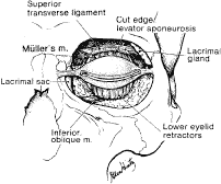 In the upper eyelid, the LPS muscle begins to develop at about 10 weeks of fetal life.14 The LPS muscle arises from the lesser wing of the sphenoid bone at the orbital apex above the annulus of Zinn and superolateral to the optic foramen. The mesenchymal origin of both the levator and the superior rectus muscles is immediately below at the annulus of Zinn. The first 40 mm of the LPS is the muscular portion, and the remaining anteriorly projecting 14 to 20 mm becomes the levator aponeurosis.10 The levator muscle crosses over the superior transverse ligament of Whitnall (STL), which is a condensation of horizontally oriented connective tissue resting within the anterior aspect of the fibrous sheath surrounding the body of the levator muscle.29 Whitnall's ligament marks the junction where the LPS changes from a skeletal muscle to a fibrous sheath, the levator aponeurosis. STL, composed of collagen and elastic fibers, is seen as a white line traversing horizontally across the eyelid, approximately 10 mm above the superior border of the tarsus (Fig. 16). The STL medially attaches to the trochlear fascia and superior oblique tendon and sends wisps of connective tissue to the medial retinaculum. It attaches laterally to the fascia surrounding the orbital portion of the lacrimal gland and at the frontozygomatic suture. The STL acts to suspend the levator complex and also serves as a fulcrum, adding a mechanical advantage to levator muscle action on the upper eyelid.3 Just posterior to Whitnall's ligament a dense intermuscular fascia interconnects the undersurface of the levator aponeurosis and the superior surface of the superior rectus muscle. A superior conjunctival fornix suspensory ligament arises from the anterior surface of this intermuscular membrane.30,31 The superior rectus muscle and the levator muscle are also joined by fibrous attachments along their medial borders. The horns of the levator aponeurosis are broad fibrous condensations in the lateral and medial edges and should be distinguished from the STL. The lateral and medial horns of the levator aponeurosis and its osseous insertions are located inferior to the STL. The lateral horn has more strength and is more tendinous than the less dense medial horn. Laterally, it courses through the lacrimal gland, dividing the gland into the palpebral and orbital lobes. The lateral horn continues inferiorly to join the lateral retinaculum and together they form a strong insertion into the lateral orbital tubercle. The medial horn of the levator aponeurosis passes over the superior oblique tendon where it has weak attachments from the STL. The medial horn continues medially to join the medial retinaculum to reach the MCT and posterior lacrimal crest. The weaker attachments medially are thought to allow a greater mobility of the medial upper eyelid.32 The lateral and medial posterior attachments are important in eyelid to globe apposition. The levator aponeurosis continues anteriorly until it joins with fibers of the orbital septum about 2 to 3 mm above the tarsal border. The orbital septum fuses with the aponeurosis at or just above the eyelid crease. At this point, additional fibers interdigitate with the orbicularis oculi muscle. The eyelid crease may vary but is typically located near the superior edge of the tarsal border at about 8 to 10 mm above the eyelid margin.29 The actual eyelid crease is formed from the attachment of the levator aponeurosis to the preseptal orbicularis muscle and subcutaneous tissue. The levator aponeurosis sends connective tissue attachments to insert on the lower one third of the anterior surface of the tarsus with its strongest attachments 3 mm above the eyelid margin.33,34,35 These tarsal attachments are crucial for upper eyelid function. Attenuation of the levator muscle and dehiscence of its attachments may demonstrate aging changes of the upper eyelid. This can result in elevation of the eyelid crease as seen in involutional blepharoptosis.3 Congenital and acquired ptosis is a drooping of the upper eyelid usually caused by poor elevating power of the upper eyelid. Congenital ptosis is typically characterized by lagophthalmos and an absence of an eyelid crease resulting from fibrofatty degeneration and poor function of the LPS. There are several classifications of ptosis. (See Volume 5, Chapter 78.) Muller's muscle, also known as the superior tarsal muscle, is the other retractor muscle of the upper eyelid (Fig. 17). It is a smooth, sympathetically innervated muscle that acts in concert with the levator muscle to elevate the upper lid. Sympathetic innervation is derived from nerve fibers, which travel along the peripheral arterial arcade and other small arteries.29 Muller's muscle is highly vascularized and is often a source of bleeding in surgery. It originates from the underside of the levator muscle approximately 20 to 22 mm above the superior tarsal border at the origin of the aponeurosis.24 High in the eyelid, Muller's muscle is loosely attached to the aponeurosis anteriorly and to the conjunctiva posteriorly. It is more adherent posteriorly to the conjunctiva as is nears the upper boarder of the tarsus. The superior tarsal muscle inserts into the upper border of the tarsal plate. Clinically, increased sympathetic stimulation as seen in fright or Grave's ophthalmopathy can retract the upper lid 2 to 3 mm above the normal resting position. Diminished tone as seen in fatigue, paralysis, or Horner's syndrome may cause the lid to drop as much as 2 mm. Topical administration of a short-term sympathomimetic agent (i.e., phenylephrine) can be used to determine preoperatively the effect of tarsal muscle surgery on ptosis.36,37 A positive result following topical administration of phenylephrine is elevation the upper eyelid 2 to 3 mm, which suggests that Muller's muscle resection may be beneficial. (See Volume 5, Chapter 78.) The retractor muscles of the lower eyelids include the inferior tarsal muscle and the 