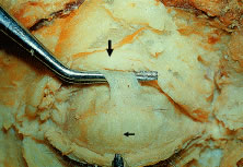 In the Asian eyelids, the eyelid creases vary in position in relation to the eyelid margin and may be lower than the occidental eyelid, or they may be absent altogether. In the upper eyelid, the orbital septum may fuse with the aponeurosis as is inserts into the tarsus. This insertion can occur as high as the superior border of the tarsus or as low as the lash line accounting for the lower or absent upper eyelid crease.3 There are also differences in the Asian lower eyelids. Epiblepharon is a common finding in the Asian lower eyelid and is seen as an additional fold of skin running horizontally below the lower eyelid margin. It is often associated with a loss of the eyelid crease or with a crease that rests very close to the eyelid margin of the lower eyelid. The absence of an eyelid crease may be due to lack of deep anchoring of the superficial skin to the preseptal portion of the orbicularis oculi muscle.18 An overriding orbicularis muscle is also associated with epiblepharon. The weight of the skin fold and the orbicularis muscle may rotate the lower eyelid margin inward, creating an entropion. FAT Fat within the orbit and eyelids serves as a protective cushion for the globe and facilitates movement of the globe. There are three general locations of fat that are described: eyelid, sub-brow, and orbital. In the upper eyelid, there are two fat pads, medial and central (preaponeurotic) (Fig. 12). The central preaponeurotic fat is divided by the trochlea of the superior oblique tendon and fascial strands of the medial retinaculum. These divisions are arbitrary and the fascial planes can be variable, because eyelid fat is interconnected and contiguous with deeper orbital fat. The preaponeurotic fat pad is an important surgical landmark, because it lies just posterior to the orbital septum and anterior to the levator aponeurosis (Fig. 13). The central preaponeurotic fat pad tends to be yellow as compared with the whiter more fibrous medial fat pad. The medial fat pad is derived from orbital fat deep to the levator muscle. It is more vascular because of the location of the palpebral arterial arcade that serpiginously courses through the medial fat pad.19,20 The lacrimal gland occupies the temporal space lateral to the central preaponeurotic fat pad. The lacrimal gland is a firm, pink, vascular, lobulated structure that produces the aqueous component of the precorneal tear film. (The anatomy and function of the lacrimal gland is described later in the chapter.) Care must be taken to avoid excision of the lacrimal gland while liposculpturing during blepharoplasty. Fine connective tissue septa extend anteriorly from the capsule of preaponeurotic fat to the orbital septum and posteriorly to the levator aponeurosis.17 The postaponeurotic or pretarsal space, located between the levator aponeurosis anteriorly and the tarsus posteriorly, may contain a small amount of peripheral orbital fat. The fibrous septa compartmentalizing superficial and deep orbital fat and extensions of the fascial sheaths of the orbital muscles and eyelid structures are of great importance to the movement of the upper eyelid.