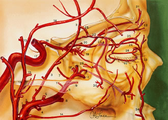 The accessory lacrimal exocrine glands of Wolfring and Krause structurally are similar to but much smaller than the main lacrimal gland. They mainly are located in the superior conjunctival fornix and above the tarsus, and fewer lie in the inferior conjunctival fornix. These are called the basal secretors because they lack direct secretory motor fibers. Other basal secretors include sebaceous glands (meibomian and Zeis) and mucous glands (goblet cells). The accessory lacrimal glands provide the tears for daily corneal hydration and secrete the aqueous layer of the tear film. Drainage of tears begins with the lacrimal puncta located medially on upper and lower eyelid margins. The punctal orifice is directed posteriorly towards the lacrimal lake where it accepts the tears. Lacrimal papillae are seen as a fibrous ring on the eyelid margin surface surrounding the lacrimal puncta. The puncta is the opening to the lacrimal drainage system and empties into the ampulla. The ampulla is oriented 1 to 2 mm vertically and is surrounded by a portion of the pretarsal orbicularis muscle and opens into the canaliculus. The canaliculus is a horizontal structure, which is directed between the plica semilunaris and the caruncle. The canaliculi are surrounded by thick pretarsal orbicularis oculi muscle fibers. The upper canaliculus in the upper eyelid is approximately 8 mm long, and the lower canaliculus is approximately 10 mm long in the lower eyelid. The blinking action of the muscles of the eyelid helps direct tears medially toward the puncta46 (Fig. 26). Capillary attraction allows tears to enter the punctum into the ampulla and canaliculus. On eyelid closure, the ampulla collapses, while the canaliculus shortens. The action of the lacrimal pump is then to draw tears through the canaliculi into the lacrimal sac, which is approximately 10 mm long. Gravity forces fluid through the elastic nasolacrimal duct, measuring approximately 12 mm, into an opening or ostium at the inferior meatus of the nose and into the nasopharynx. Valve-like folds of epithelium line the nasolacrimal duct preventing the retrograde flow of tears and air. The valve of Rosenmüller is located at the junction of the common canaliculus as it enters the nasolacrimal sac. This fold prevents reflux of tears back into the sac from the canaliculi. An incompetent valve may allow reflux of purulent material from the sac into the eye in nasal lacrimal duct obstruction. The valve of Hasner is located on the distal end of the duct. This is often imperforate at birth in neonates and is a major cause of epiphora in infants. It usually undergoes perforation within 6 months after birth spontaneously or after manual massage of the sac. VASCULAR SUPPLY A network of vessels derived from two major sources, the internal and the external carotid arteries, richly vascularizes the eyelids (Fig. 27). The internal carotid artery supplies the deep or intraorbital vascular system including the ophthalmic artery, whose terminal branches primarily supply the upper eyelid. The external carotid artery supplies the superficial arterial system namely facial and angular arteries, which principally supply the lower eyelid. Collateralization between the internal and external systems contributes to the rapid wound healing and the low incidence of infection following eyelid surgery. As the vessels approach the eyelids, branches of the ophthalmic artery from the internal carotid artery and branches of the lacrimal arteries off of the maxillary branch of the external carotid artery form the marginal and peripheral vascular arcades of the eyelids. At the orbital apex, the ophthalmic artery, a branch of the internal carotid artery, enters the orbit through the optic canal lateral to the optic nerve (Fig. 28). As the ophthalmic artery passes over the optic nerve and continues supermedially within the orbit, four terminal branches pierce the orbital septum to supply the upper eyelid. The four branches include the lacrimal artery, the supraorbital artery, the supratrochlear (frontal) artery, and the dorsal nasal artery.47,48 The lacrimal artery runs temporally along the upper border of the lateral rectus muscle along with the lacrimal nerve and terminates as the lateral palpebral artery. This is the blood supply to the lacrimal gland, the conjunctiva and the lateral aspect of the upper eyelids. The supraorbital artery branches off the ophthalmic artery as it courses over the optic nerve and travels forward between the levator muscle and the periorbita of the roof. It accompanies the supraorbital nerve through the supraorbital foramen to supply the upper eyelid, scalp, forehead, levator muscle, periorbita, and diploë of the frontal bone.3 The supratrochlear (frontal) artery accompanies the supratrochlear nerve to supply the skin of the superior medial aspect of the orbit, the forehead, and scalp. The ophthalmic artery pierces the orbital septum dorsonasally to become the dorsal nasal artery. This supplies the skin of the bridge of the nose and the lacrimal sac, terminating as the medial palpebral artery. The medial palpebral artery and the lateral palpebral artery anastomose to form the vascular arcades of the upper eyelids. The marginal palpebral arcade lies on the anterior tarsal surface 2 to 3 mm from the eyelid margin. The peripheral palpebral arcade courses above and parallel to the superior border of the tarsus, between the levator aponeurosis and Muller's muscle in the upper eyelid. Medially, the arcades run a tortuous course throughout the medial fat pad. The medial fat pad is often a site of bleeding during blepharoplasty.20 The deep peripheral palpebral arcade anastomoses with the anterior ciliary arteries near the corneal scleral limbus and supplies the superior conjunctival fornix.3 In the lower eyelid, a marginal arcade arises from the medial and lateral palpebral branches running horizontally approximately 3 mm inferior to the lower eyelid margin and anterior to th