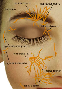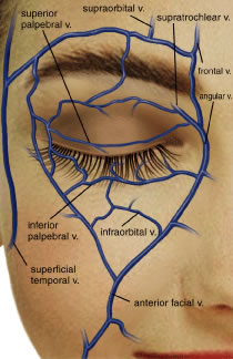 VENOUS SYSTEM The venous drainage system of the eyelids is through the tributaries of the ophthalmic vein and superficially through the angular and superficial temporal veins12 (Fig. 30). The junction of the superficial frontal vein and the supraorbital vein from the orbit forms the angular vein. The angular vein has a dual drainage: posteriorly into the deep venous system by the superior ophthalmic vein and superficially and inferiorly into the anterior facial vein. The angular vein then empties into the common facial vein, which empties into the internal jugular vein. Superiorly and laterally, venous blood from the forehead, eyebrow, and eyelid drain from the supraorbital vein into the superficial temporal vein to drain into the external jugular vein.24 Anteriorly, the angular vein anastomoses with the orbital venous system. The deep venous system draining the forehead, eyebrow, and upper eyelid is via the supraorbital vein coursing into the frontal vein and into the superior ophthalmic vein. The union of the angular and supraorbital veins forms the superior ophthalmic vein at the supranasal aspect of the orbit. The superior ophthalmic vein is formed at the supranasal orbit by union of the supraorbital and angular veins. It is in close proximity to the ophthalmic artery as it travels posterolaterally in the orbit. The superior ophthalmic vein penetrates the muscle cone and receives drainage from the superior vortex veins of the globe. The superior ophthalmic vein also receives drainage from the ethmoidal, lacrimal, central retinal, and ciliary veins. It is joined at the orbital apex by the inferior ophthalmic vein. It leaves the orbit through the superior orbital fissure and enters the cavernous sinus. The inferior ophthalmic vein is part of a venous plexus at the anterior orbital floor that is a tributary for the lower eyelid, lacrimal sac, inferior rectus muscle, inferior oblique, and two inferior vortex veins. At the orbital apex, one branch of the inferior orbital vein feeds into the superior ophthalmic vein and enters the cavernous sinus and another branch drains through the inferior orbital fissure to the pterygoid plexus. LYMPHATIC SYSTEM The lymphatic system of the eyelids is divided into a superficial and a deep system. The superficial system drains skin and orbicularis, whereas the deep system drains the tarsi and the conjunctiva.49 The upper eyelid, lateral ½ of the lower eyelid, and the lateral canthus empty into the preauricular and deep parotid nodes. The skin and orbicularis oculi muscles drain into the deep cervical nodes near the internal jugular vein. The medial portion of the upper and lower eyelids, the medial canthus, and the conjunctiva drain into the submandibular nodes. Lymphadenopathy may correlate to inflammation or infection of the affected anatomic eyelid structure. NERVES Three of the 12 cranial nerves essentially supply the eyelids: the oculomotor nerve (CN-3), the trigeminal (CN-5), and the facial nerve (CN-7). The eyelids also receive sympathetic innervation. CN-3: The oculomotor nerve provides motor innervation to several extraocular muscles and the upper eyelids. The oculomotor nerve originates from the midbrain and passes into the interpeduncular fossa to enter the middle cranial fossa piercing the dura and enters the lateral wall of the cavernous sinus. As it travels along the lateral wall of the cavernous sinus, it divides into the superior and inferior divisions before entering the orbit through the superior orbital fissure into the annulus of Zinn.3,7 The superior division courses 1 mm anterior to the annulus of Zinn and innervates the superior rectus muscle. The nerve courses medially where it innervates the LPS. The inferior division courses beneath the optic nerve branching to innervate the medial rectus, inferior rectus, and inferior oblique muscles. Parasympathetic fibers run with the oculomotor nerve and synapse in the ciliary ganglion. CN-5: The trigeminal nerve divides into the ophthalmic, maxillary, and mandibular branches and is the major sensory nerve of the eyelids and face (Fig. 31). It arises from the pons from the sensory, motor, and mesencephalic roots. These roots meet at the gasserian ganglion at the petrous bone. The first two branches continue in a path to provide sensory supply to the eyelids, coursing through the middle cranial fossa and piercing the dura to enter the lateral wall of the cavernous sinus. The first ophthalmic division enters the orbit through the supraorbital foramen where it subdivides into the lacrimal, frontal, and nasociliary nerves. The lacrimal nerve enters the orbit above the annulus of Zinn and gives sensory innervation to the lacrimal gland, the lateral aspect of the eyelid, and the forehead. A superior branch sends sensory fibers to the lacrimal gland and skin as the lateral palpebral nerve. An inferior branch of the lacrimal nerve innervates the lacrimal gland and anastomoses with the fibers from the zygomaticotemporal branch of the maxillary division of V2, which carries parasympathetic secretory fibers to the lacrimal gland from CN-7. The frontal nerve enters the orbit outside the annulus of Zinn and courses anteriorly to branch into the supraorbital and supratrochlear nerves (Fig. 32). The supraorbital nerve leaves the orbit through the supraorbital foramen or supraorbital notch and innervates the skin of the upper eyelid, forehead, and scalp. The supratrochlear nerve passes above the trochlea and pierces the septum at the superonasal aspect of the orbit giving sensory innervation to the medial commissure, the skin of the root of the nose, the middle forehead, and the lacrimal drainage structures. It also sends a branch to an infratrochlear twig of the nasociliary nerve.50