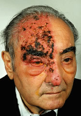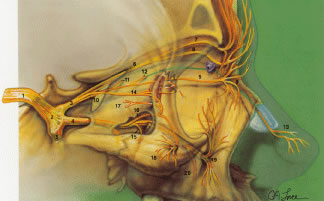 The nasociliary nerve enters the orbit laterally within the annulus of Zinn, courses over the optic nerve along the medial orbit and gives off several branches. Branches of the nasociliary nerve include: (1) long sensory root of the ciliary ganglion; (2) long ciliary nerves to supply the iris, ciliary body, and cornea; (3) infratrochlear nerve supplying the medial canthus, conjunctiva, lacrimal sac, canaliculus, and caruncle; and (4) posterior ethmoidal nerve supplying the ethmoidal air cells and sphenoid sinus.49 Patients with herpes zoster ophthalmicus who have skin lesions along a V1 dermatome and a lesion on the tip of the nose with associated kerato-uveitis (Hutchison's sign) typically have nasociliary nerve (branch of V1) involvement (Fig. 33).