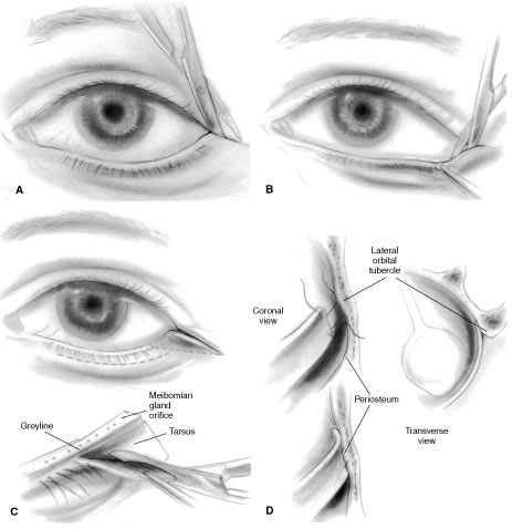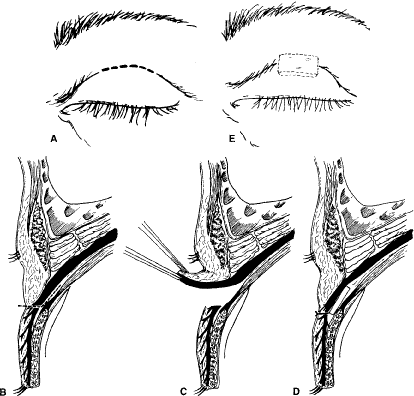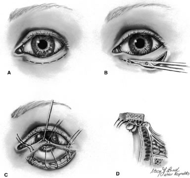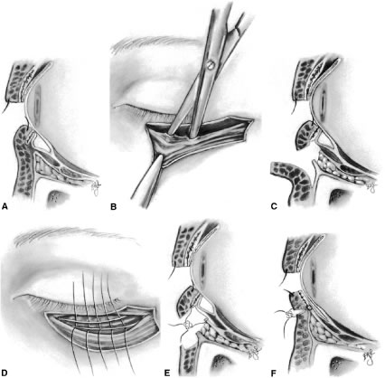 Internal scarring procedures to stabilize the eyelids have been very helpful in minimizing ocular irritations. Quickert and Rathbun48 advocated suture repair for entropion (Fig. 14A, suture a), and Iliff49 later modified this procedure (see Fig. 14A, suture b). The placement of horizontal mattress sutures from the inferior fornix to exit the skin directly beneath the eyelashes (as in the Iliff modification) enhances the everting forces of the eyelid. This procedure is easy to perform and serves as an excellent temporizing procedure until a more definitive procedure is possible. In eyelids with a minimal degree of horizontal lid laxity, such treatment may suffice indefinitely. In eyelids with a greater degree of horizontal laxity, care must be taken not to use too much eversion effect with the Iliff modification, or an immediate ectropion can be created. Also, in eyelids with spastic entropion, such as following ocular surgery or ocular irritations, this procedure may stabilize the lid until the irritating focus has resolved. The type of suture material used for Quickert-Rathbun sutures is not as important as the tension with which the sutures are tied. The suture tension can lead to focal tissue necrosis and scarring, giving Quickert-Rathbun sutures the potential for some permanent correction. Double-armed sutures provide the safety of making all suture passes away from the globe. 4-0 chromic gut sutures generally remain in place for 2 weeks, which is long enough to provide the necessary effect without the need for scheduled suture removal. Silk and polyglactin sutures will last longer but can lead to tissue infections resulting from the duration and their polyfilament structure. Nylon sutures are less likely to cause infection but are sometimes uncomfortable for the patient because of their stiffness. Patients with entropion usually require a combined procedure to eliminate horizontal lid laxity and repair the lower lid retractors.50 No procedure addressing an isolated anatomic feature has been universally successful in alleviating entropion. Isolated repair of lower lid retractor defects (analogous to repair of the levator aponeurosis in ptosis procedures) often results in lower lid retraction or actual ectropion.51–53 This is due to the preexisting significant horizontal eyelid laxity, which again promotes an unstable eyelid margin. The tendency is further exacerbated if the lower eyelid retractor is inadvertently advanced onto the tarsus. If horizontal eyelid laxity is evident, a tarsal strip procedure should be performed, as discussed for the treatment of ectropion (see Fig. 6). Various suture placements through the lateral tarsal strip as in the correction of ectropion or entropion described by McCord and coworkers54 are not relevant. The goal of the tarsal strip procedure is to firmly affix the tarsus to the inner aspect of the lateral orbital rim. This is best accomplished by using two interrupted 5-0 nonabsorbable monofilament sutures, although some surgeons prefer 4-0 or 5-0 polyglactin. The sutures should be tied on the anterior tarsal surface; attempts to bury the knots beneath the tarsus will prevent adequate tarsal approximation to the inner aspect of the lateral orbital rim. The preferred procedure for involutional entropion thus consists of a lateral tarsal strip and repair of the lower eyelid retractors. Isolated lower lid retractor repairs are inappropriate—an invitation for additional procedures. A lateral canthal incision is created and extended in an infralash position, and a skin muscle flap is elevated to expose the orbital septum (Fig. 15B and C). The orbital septum is penetrated and orbital fat identified and retracted inferiorly. Directly beneath the orbital fat is the white fibrous appearing lower eyelid retractor. This is directly analogous to the location of the levator aponeurosis in the upper eyelid. The lower eyelid retractor is normally attached to the inferior tarsal border; however, in entropion, a defect is generally apparent between the lower eyelid retractor and the tarsus. The superior edge of lower eyelid retractor system is identified and carefully reapproximated to the inferior tarsal border (see Fig. 15D and E). Care should be taken not to advance the lower eyelid retractor to prevent lower eyelid retraction or actual ectropion. A lateral tarsal strip procedure as described in the section on ectropion should then be performed to tighten the eyelid horizontally (see Fig. 6). Herniated orbital fat is an important etiologic factor in promoting orbicularis muscle overriding and creating tarsal instability. Redundant orbital fat is carefully removed. To finalize the procedure, redundant skin is draped over the lid margin and is excised as in a lower lid blepharoplasty. Skin removal should be minimal to prevent ectropion. It is this combination type of procedure that produces minimal recurrences and has been extremely successful in managing entropion. The Weis (transverse tarsotomy) procedure has also been advocated for the correction of entropion. This procedure everts the lid margin and produces an anatomic barrier that prevents preseptal orbicularis muscle override and secondary tarsal rotation (Fig. 16). It has been advocated for involutional entropion but is best suited for patients with varying degrees of cicatricial entropion. The Weis procedure has been called the two-snip procedure and is relatively easy to perform. A stab incision is created through the full thickness of the lid at the inferior aspect of the tarsus approximately 3 mm from the eyelid margin (Fig. 16A). A sharp iris scissors is used to extend the full-thickness lid incision nasally and temporally (hence the two-snip procedure) (see Fig. 16B). The short vertical height of the tarsus of the lower eyelid,55 especially in patients with cicatricial entropion, makes the incision of the tarsus challenging. An alternative method of creating this full-thickness horizontal eyelid in