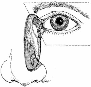 The periosteum anterior to the bony opening should be elevated from bone with a periosteal elevator for 2 to 3 mm to allow later suturing of the lateral edge of the periosteum with the medial canthal tendon back to its normal anatomic position. The nasal packing is removed to relax the mucosa, and the bony opening extended to about 15 mm in diameter, approximately thumbnail size (Fig. 39). The lacrimal sac is identified beneath the periosteal layer, which has been reflected laterally, by placing a blunt right-angle probe (Werb, Dixey Co., London, England)) or Bowman probe into one canaliculus to point up under the periosteum. The sac can be entered with a scalpel blade, by cutting directly over the probe, or preferably by cutting the sac with right-angle scissors (Werb). Cutting also can be done at the entrance of the sac to the nasolacrimal duct (Fig. 40). This step is facilitated by prior removal of the medial wall of the nasolacrimal duct. One blade of the scissors is passed into the opening created at the top of the duct, and the sac is divided from an inferior to a superior direction. The most important flaps are the anterior flaps from the sac and the nasal mucosa because the posterior flaps will fall together. The only concern with large posterior flaps is the creation of a posterior sac or nasal flap that is too large and might move out of position postoperatively occluding the common internal punctum where the canaliculi enter the sac. This problem is avoided with the use of short posterior flaps. Before incising the nasal mucosa, the surgeon removes the nasal packing and passes a small curved hemostat up to the nose to indent the mucosa and confirm that the space to be entered is actually in the nose and not in an anteriorly placed ethmoidal air cell. Nasal mucosal flaps are fashioned after incision of the mucosa from the inferior to the superior end of the bony opening. The width of the anterior flap is important; there must be an adequate flap to suture to the anterior flap of the lacrimal sac if this type of technique is used. The posterior flaps can be closed with interrupted 4–0 or 5–0 absorbable sutures on a semicircle needle, or they can be cauterized together.81,82 Closure of the posterior flaps usually is not necessary if the flaps are short and lie in near apposition. In this position, the flaps will not be able to occlude the internal common punctum postoperatively. An alternative method recommended by McCord6 is to create a large posterior flap of nasal mucosa by incising the nasal mucosa high and folding it down to meet a short posterior flap of lacrimal sac. The anterior flap is formed entirely of lacrimal sac. The incision into the lacrimal sac is made very posterior so that a large anterior mucosal flap is created; the flap can be sutured to the remaining anterior nasal mucosa or to periosteum at the end of the bony opening (Fig. 41). This method also is useful if the nasal mucosal flap has been damaged or inadvertently cut near the top of the bony ostium. The DCR also has been described without forming any flaps but we do not recommend this for the external approach.83