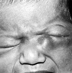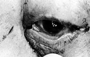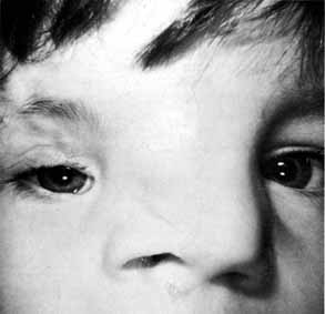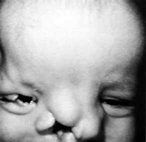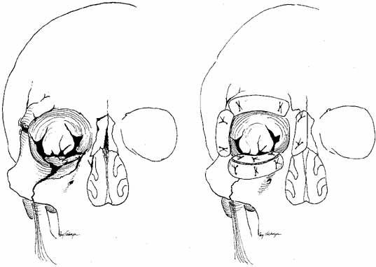 Neoplasms of the lacrimal sac can occur, and may present as functional blocks. Dacryocystography may be helpful in diagnosing these masses preoperatively. A frozen section is mandatory. Malignancy of the sac is one of the few indications for a dacryocystectomy. The nasopharynx should not be opened because of the potential risk of spread of a malignant tumor. Congenital entropion, distichiasis, or trichiasis can stimulate reflex tearing and cause epiphora. Appropriate steps should be taken to identify and surgically correct these problems. Ectropion of the punctum or lid is rare as a congenital problem. Medial canthal or lacrimal sac tumors are best excised with careful margin and base controls.6,47,48 No attempt should be made initially to violate the bone or nasal mucosa. Canaliculoplasty to the lacrimal sac or Silastic intubation through the nasolacrimal duct can be considered. A DCR or Jones bypass tube should be avoided until at least 1 year has elapsed without clinical or radiographic evidence of tumor recurrence. This waiting period is mandatory to avoid seeding malignant cells into the nasopharynx. It is better for the patient to experience epiphora than to risk tumor seeding, which may have life-threatening consequences. Dacryocystectomy should be reserved for treatment of lacrimal sac tumors.112 It is not an appropriate technique for the relief of uncomplicated epiphora that results from lower system block. If necessary, bypass surgery can be done later, regardless of whether flaps, skin grafts, or granulation had been used to cover the dissected area in the medial canthal region. MAJOR CONGENITAL CRANIOFACIAL DEFORMITIES Any of the lacrimal abnormalities described above can occur singly or in combination with craniofacial anomalies. Repair for each entity is identical to that previously described for routine lacrimal problems. However, the timing of repair is different.111 Deformities such as telecanthus, epicanthal folds, orbital volume problems, and many canthal deformities can be managed during the initial craniofacial reconstruction. Specific nasolacrimal problems, however, except for simple dacryostenosis or acute dacryocystitis, are best treated after major bone shifts or on lay bone grafts in the midface region have been completed. Unfortunately, good results are too easily undone by subsequent surgery. Repeat lacrimal procedures are particularly difficult and have significantly less potential for success (Figs. 60 and 61).