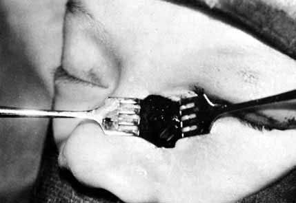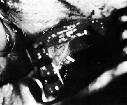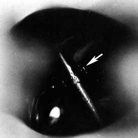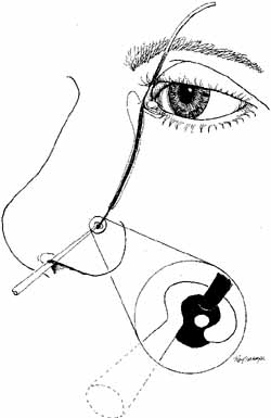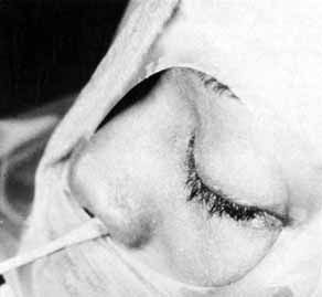 Many methods have been devised in an attempt to improve the original grooved director retrieval method of Quickert and Dryden.63 A straight hemostat often can be used successfully in a larger child, particularly when the turbinate is infractured. However, the malleable Crawford-type probes offer an advantage in that they can be retrieved, even in a small infant, by using the corresponding hook Fig. 24).64,74 It is important to recall the intranasal anatomy while retrieving the malleable probe. The nasal floor, which is also the palate, is the inferior limit of the inferior meatus. The inferior turbinate arises from the lateral nasal wall. Thus, by staying parallel to the palate and directing the hook laterally towards the ear, the inferior meatus is easily located. After entering the inferior meatus, tactile movement is required to locate and retrieve the Crawford probe. Detachment of the Silastic from the probe may occur when the probe is retrieved from the inferior meatus of the nose and the junction of the tubing and the probe is pulled through the punctum into the nasolacrimal system. Usually, dilation of the punctum before insertion of the probe and application of an ointment for lubrication at the junction of the metal and Silastic will prevent this detachment.