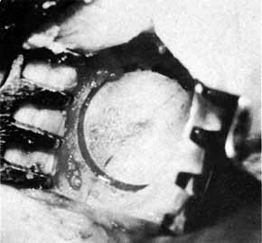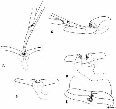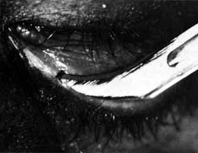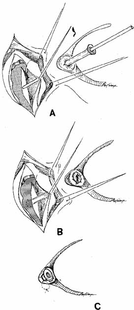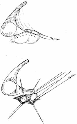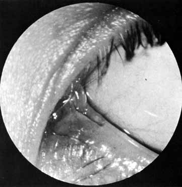 The common internal punctum should be examined carefully by passing blunt probes through this structure through each canaliculus (Fig. 42). Most patients have a true shared internal entrance of the canaliculi, but occasionally, there may be separate, but normal, internal puncta.43 Any scars or obstructions of this area must be excised with scissors, and a new common opening created by intubating the canaliculi with Silastic material (Fig. 43).