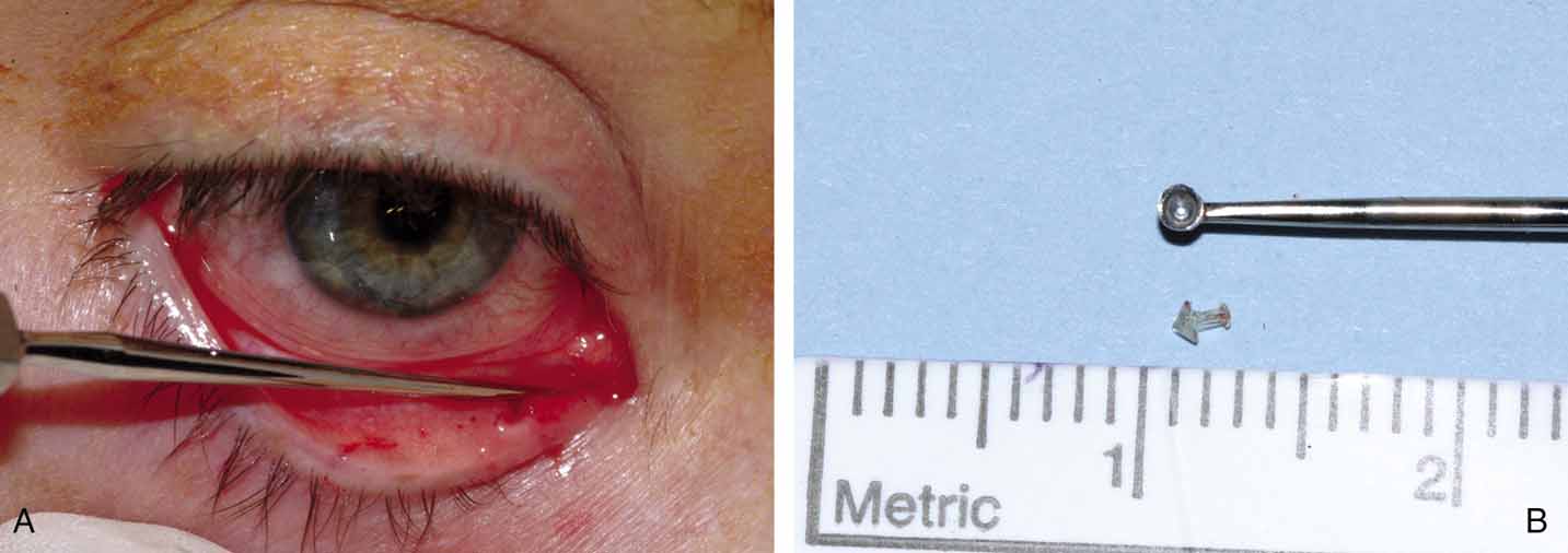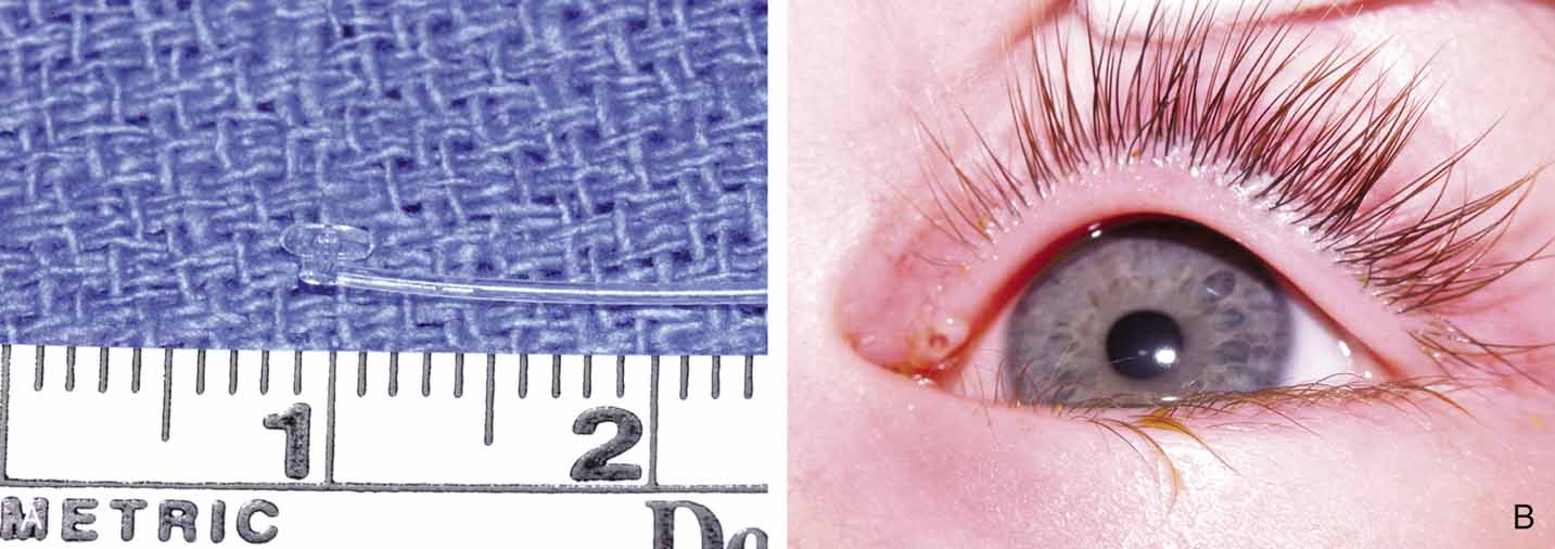 FIXATION OF TUBING. Monocanalicular stents are easy to fix in place. Once placed, the tubing has a collarette with a punctal anchor on the proximal end that nicely seats itself in the puncta similar to a punctal plug. The collarette has two components: a flat surface that lies on the lid margin, and a small bump under the plate, that anchors into the puncta (Fig. 27A and 27B). The colarette comes in two sizes, 3 mm and 4 mm. We prefer the smaller 3-mm–sized stents for use in infants and toddlers.72 For adolescents and adults, we recommend using the 4-mm–sized tubes. The stent is placed over a Ritleng probe as previously described. Of note, the difficulty with these tubes is not fixation but rather the passage through the nasolacrimal system. Once the stent is in place, a small punctal plug seating device is inserted into a small hole in the anchoring plate. The surgeon can facilitate seating the stent by simultaneously pulling the distal prolene potion and pushing the anchor with the seating device. A small pop is felt when then anchor locks into the punctum. If the punctal plug seating device is not available, a number 0000 Bowman probe or a fine tip punctal dilator can be used instead.